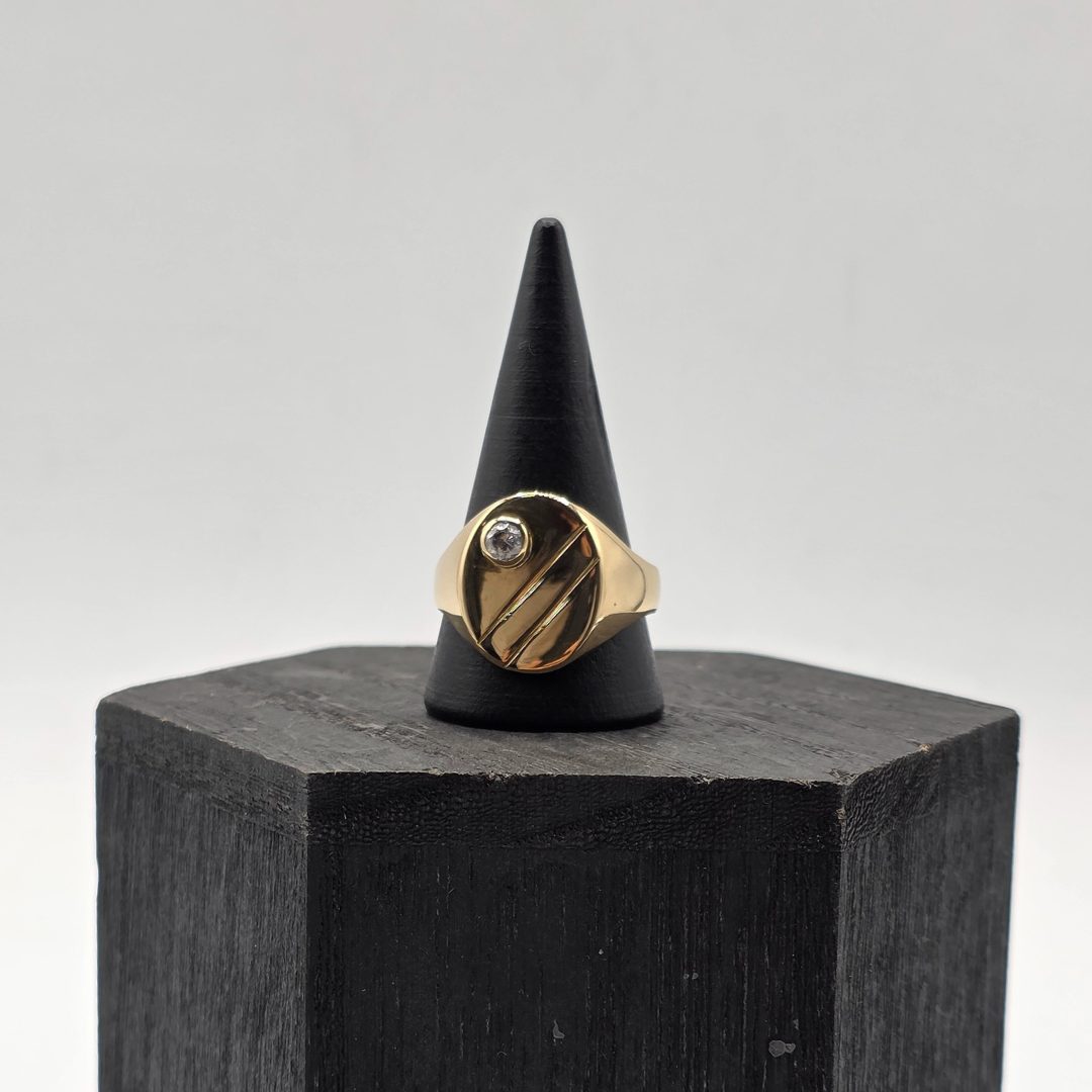 Fuerte, sofisticado y con un toque de lujo atemporal. Este anillo tipo sello en oro de 18 quilates combina un diseño clásico y robusto con la elegancia de un diamante natural engastado, creando una pieza imponente y refinada.