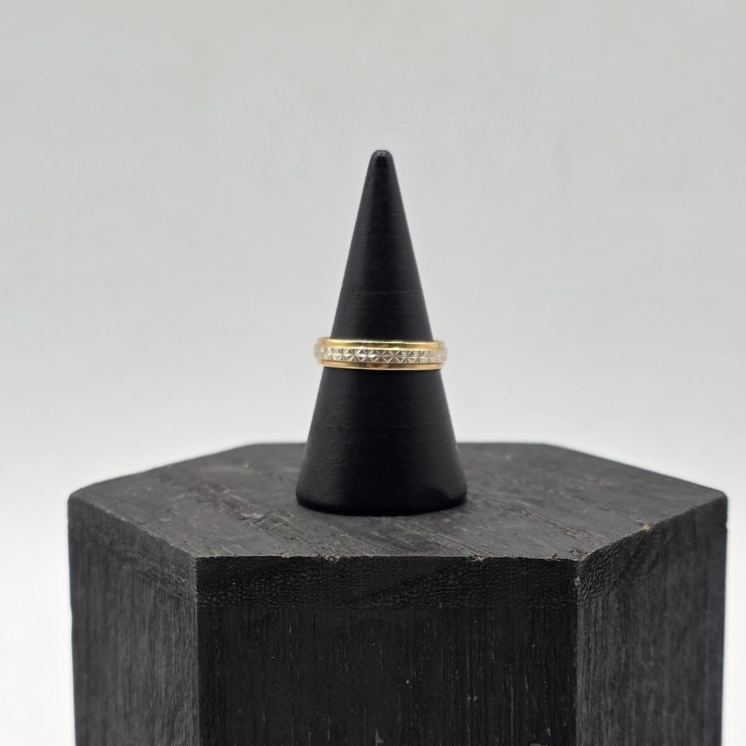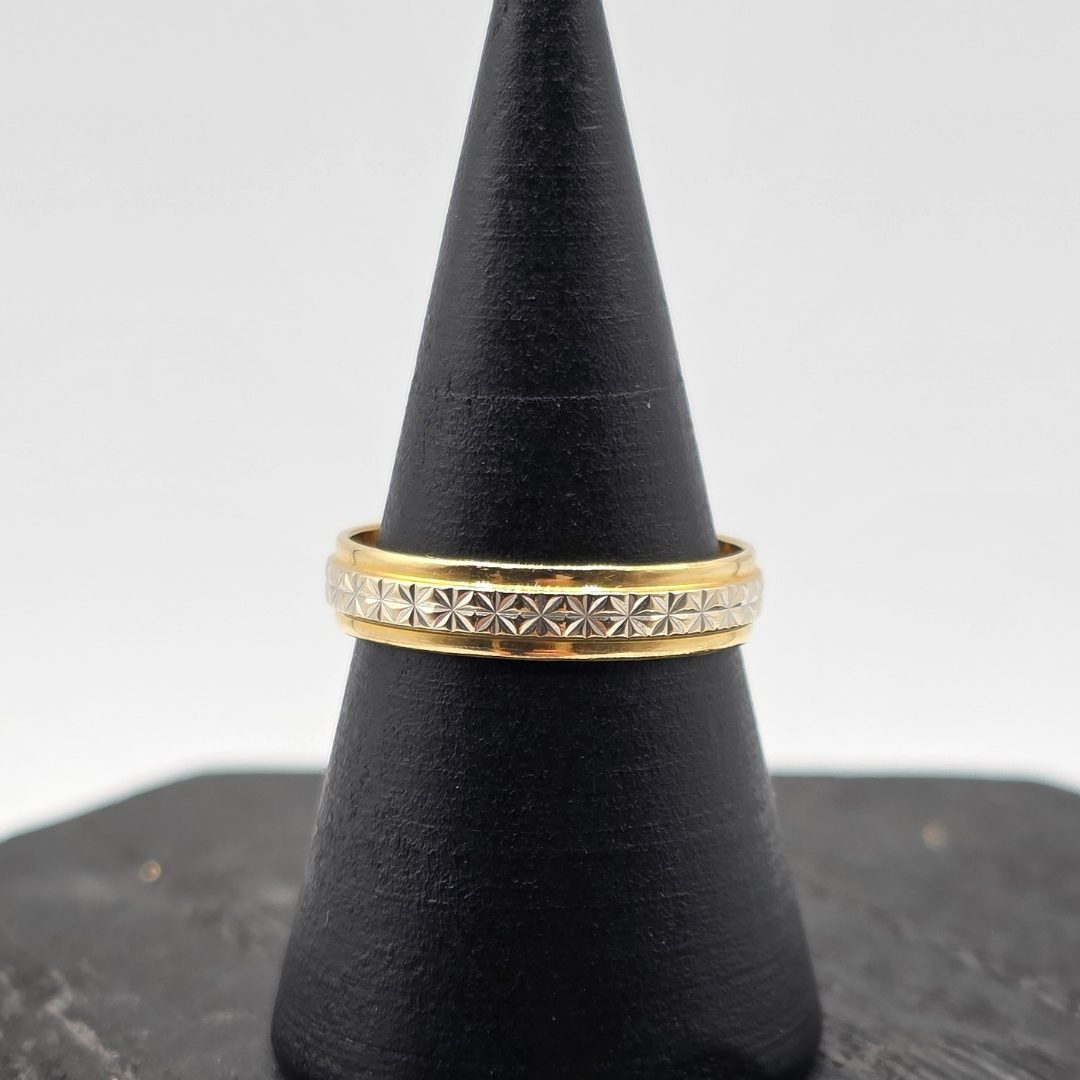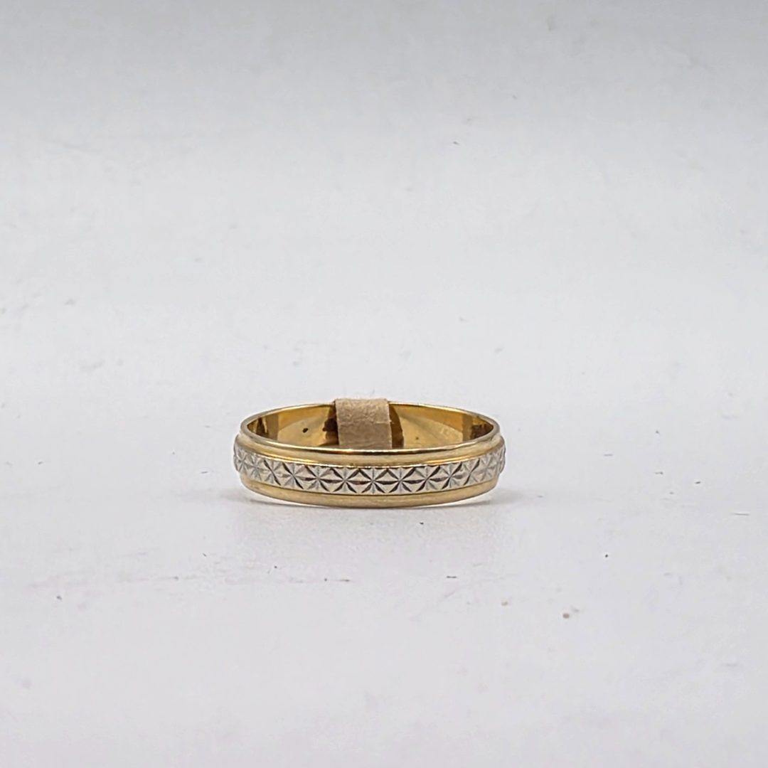 Sofisticación con contraste. Esta alianza en oro de 18 quilates combina armoniosamente oro blanco y oro amarillo, creando un diseño moderno y equilibrado.