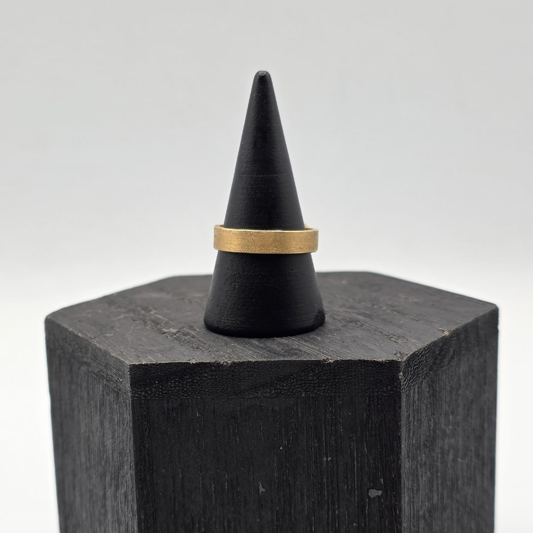 Sencillez con carácter. Esta alianza de oro de 18 quilates destaca por su acabado mate, que le da un toque moderno, sobrio y sofisticado. Su diseño minimalista y elegante la convierte en una opción perfecta para quienes prefieren un estilo discreto pero con personalidad.
