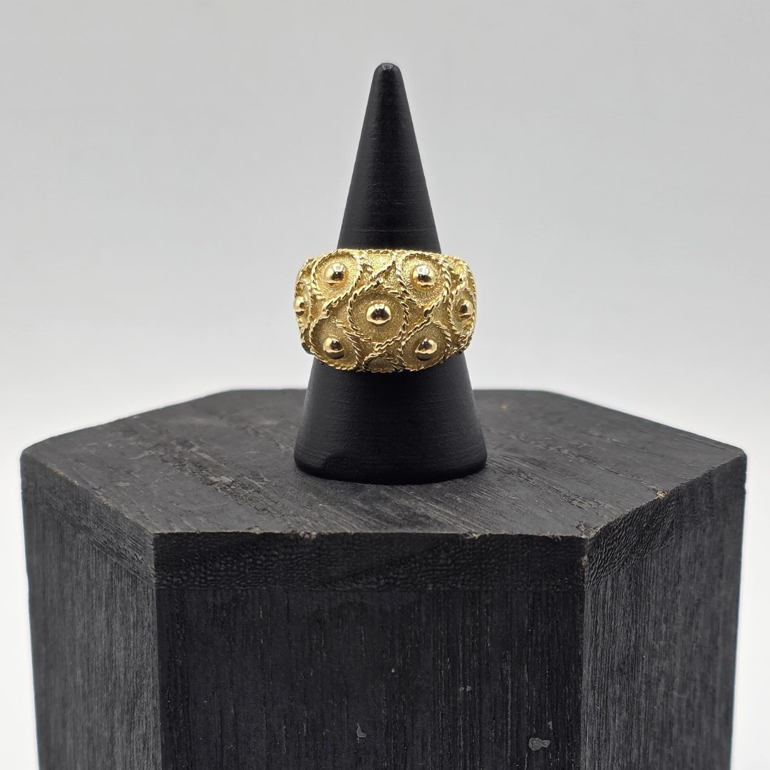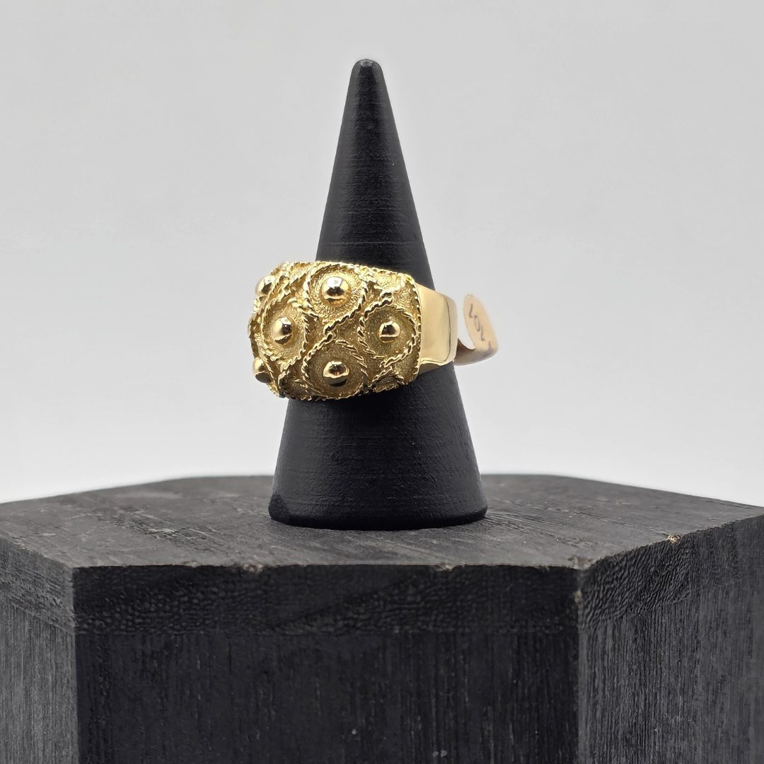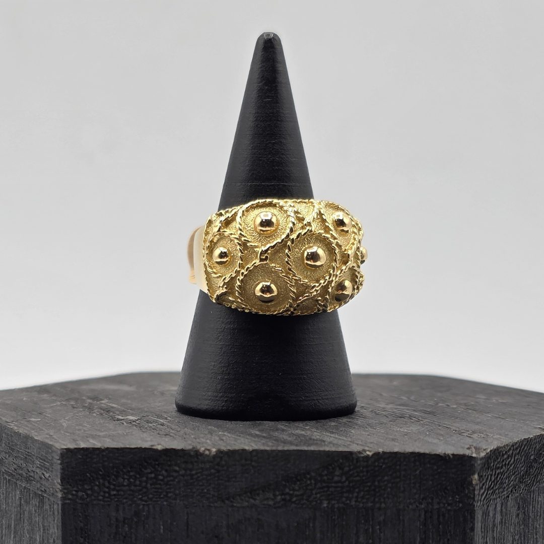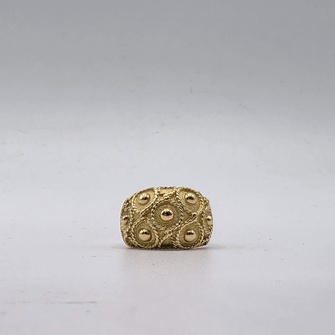 Este anillo en oro de 18 quilates presenta tres filas de delicadas bolitas, cada una en un tono de oro distinto: oro blanco, oro rosa y oro dorado.