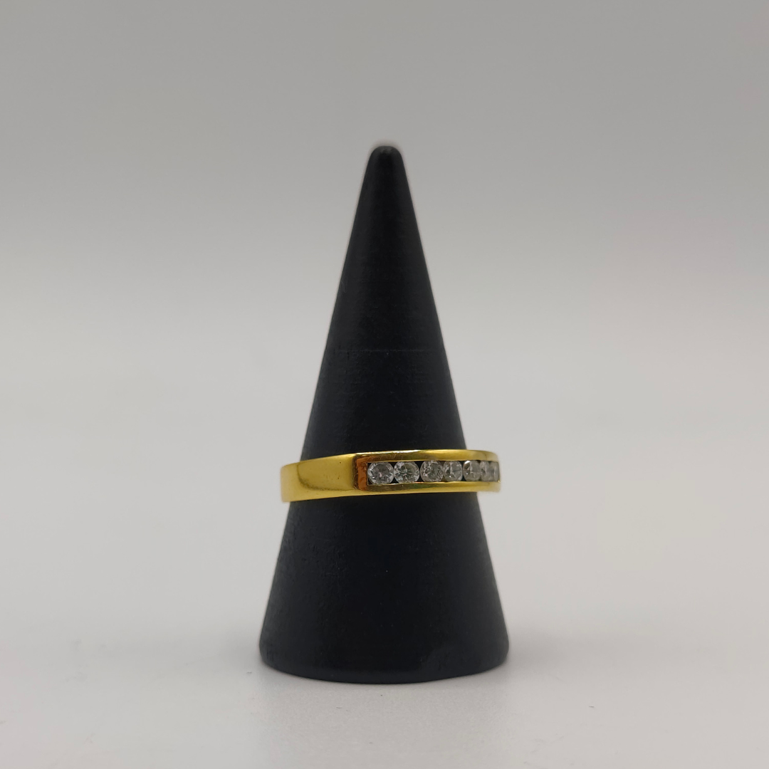 Este elegante anillo de oro de 18 quilates es una celebración del lujo y la sofisticación, diseñado para captar todas las miradas. La pieza presenta un diseño clásico y atemporal, en el que se destacan siete diamantes brillantes, dispuestos de manera exquisita para resaltar su belleza y luminosidad.