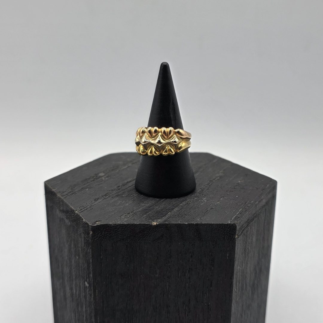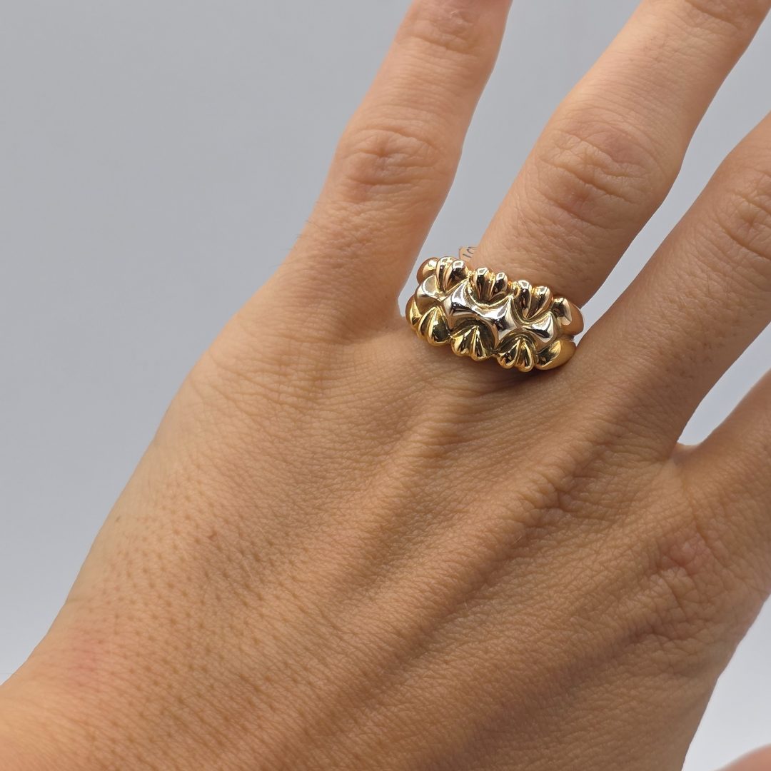 Este encantador anillo en oro de 18 quilates presenta una delicada combinación de corazones en oro dorado y oro rosa, creando una pieza elegante y llena de significado. Los corazones, símbolos universales de amor y afecto, están perfectamente fusionados con los dos tonos de oro, aportando un contraste suave pero impactante. El oro dorado resalta la calidez y la riqueza, mientras que el oro rosa agrega un toque romántico y moderno. Ideal para quienes buscan una joya que combine ternura, sofisticación y estilo atemporal, este anillo es perfecto para ocasiones especiales o como un regalo significativo.