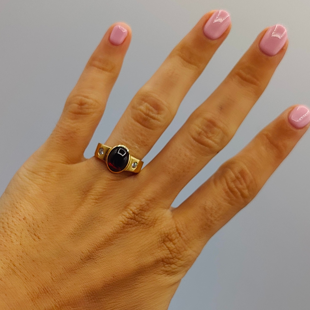 Descubre la elegancia atemporal de nuestro anillo, con un rubí ovalado en el centro, flanqueado por dos diamantes brillantes, todo montado en oro de 18 quilates.
