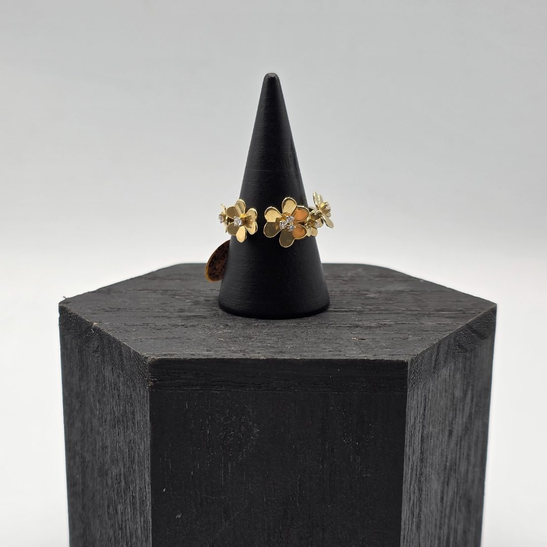 Delicado y lleno de brillo, este exquisito anillo en oro de 18K presenta un encantador diseño floral, donde cada flor está cuidadosamente elaborada.