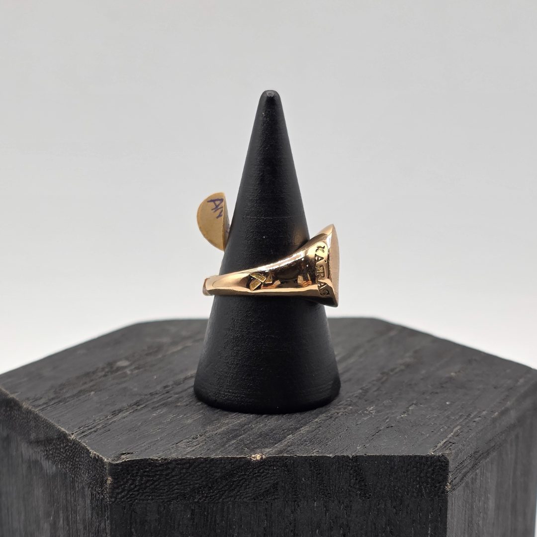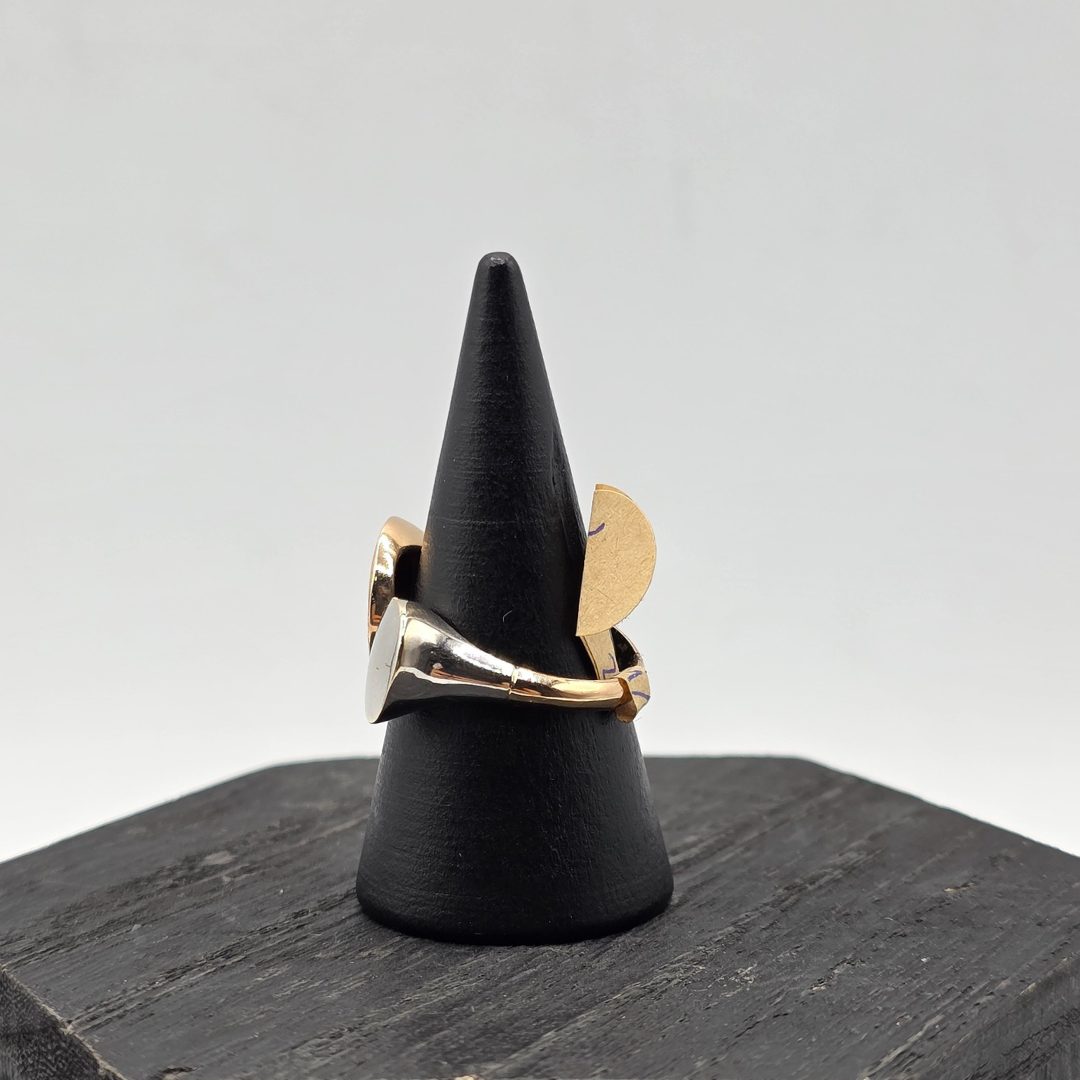Este elegante anillo combina dos círculos perfectos, cada uno con un acabado único, que representan la armonía entre el brillo y la suavidad.