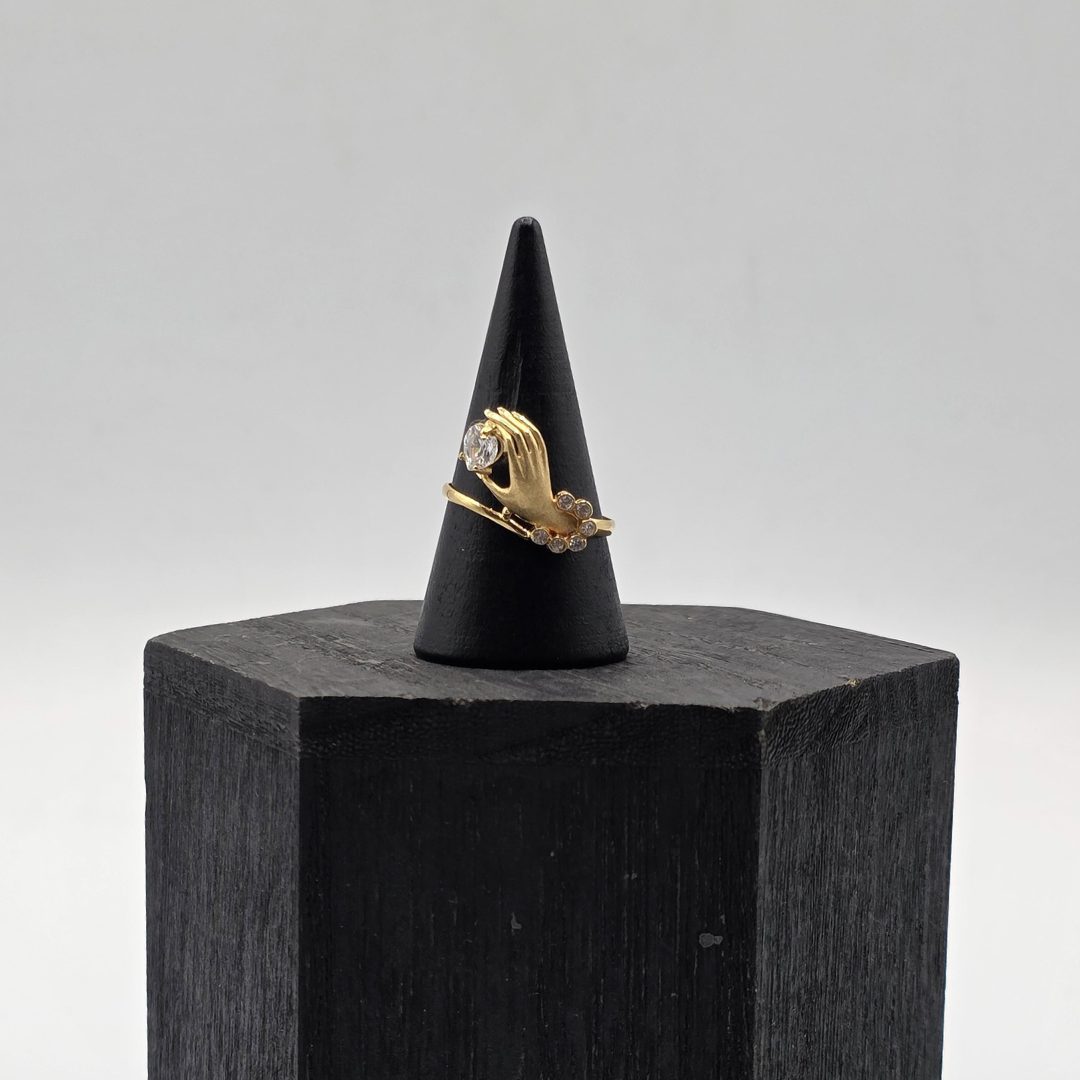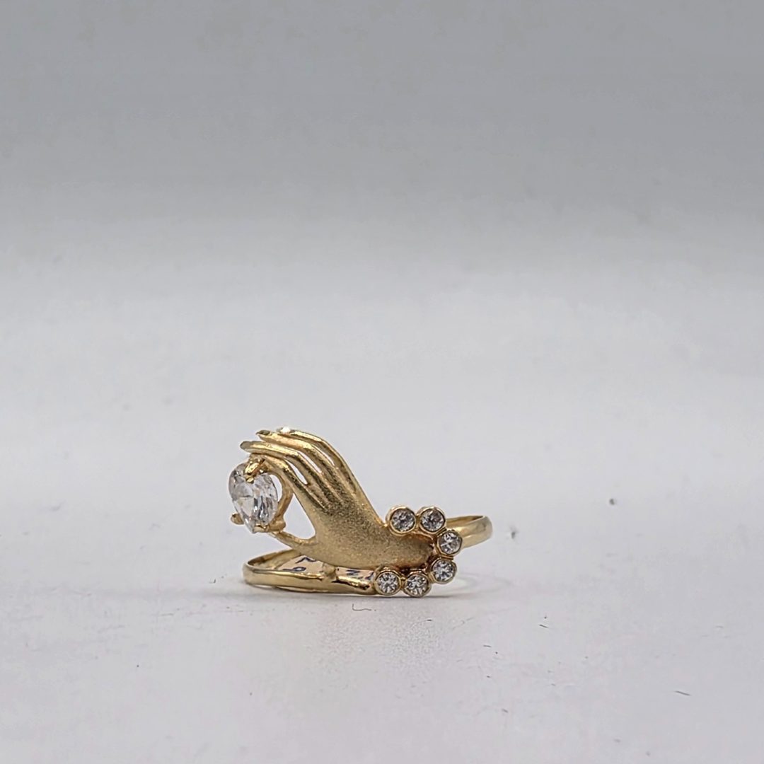 Un diseño simbólico y lleno de encanto. Este anillo de oro de 18 quilates presenta una delicada mano esculpida que sostiene un corazón formado por circonitas brillantes, símbolo de amor, protección y conexión.