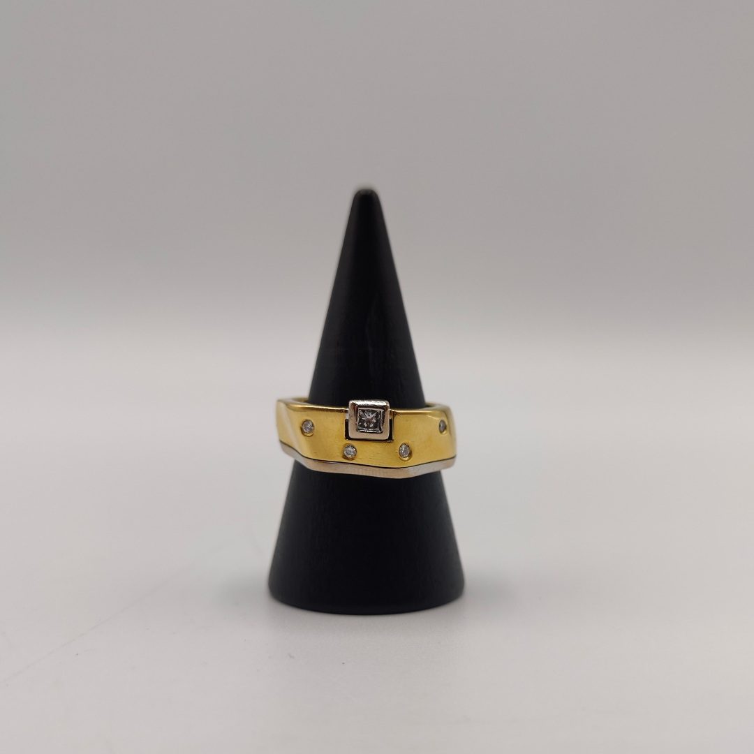 Este cautivador anillo de oro de 18 quilates es una obra maestra que combina la belleza de los diamantes con una sofisticada mezcla de oro dorado y blanco.