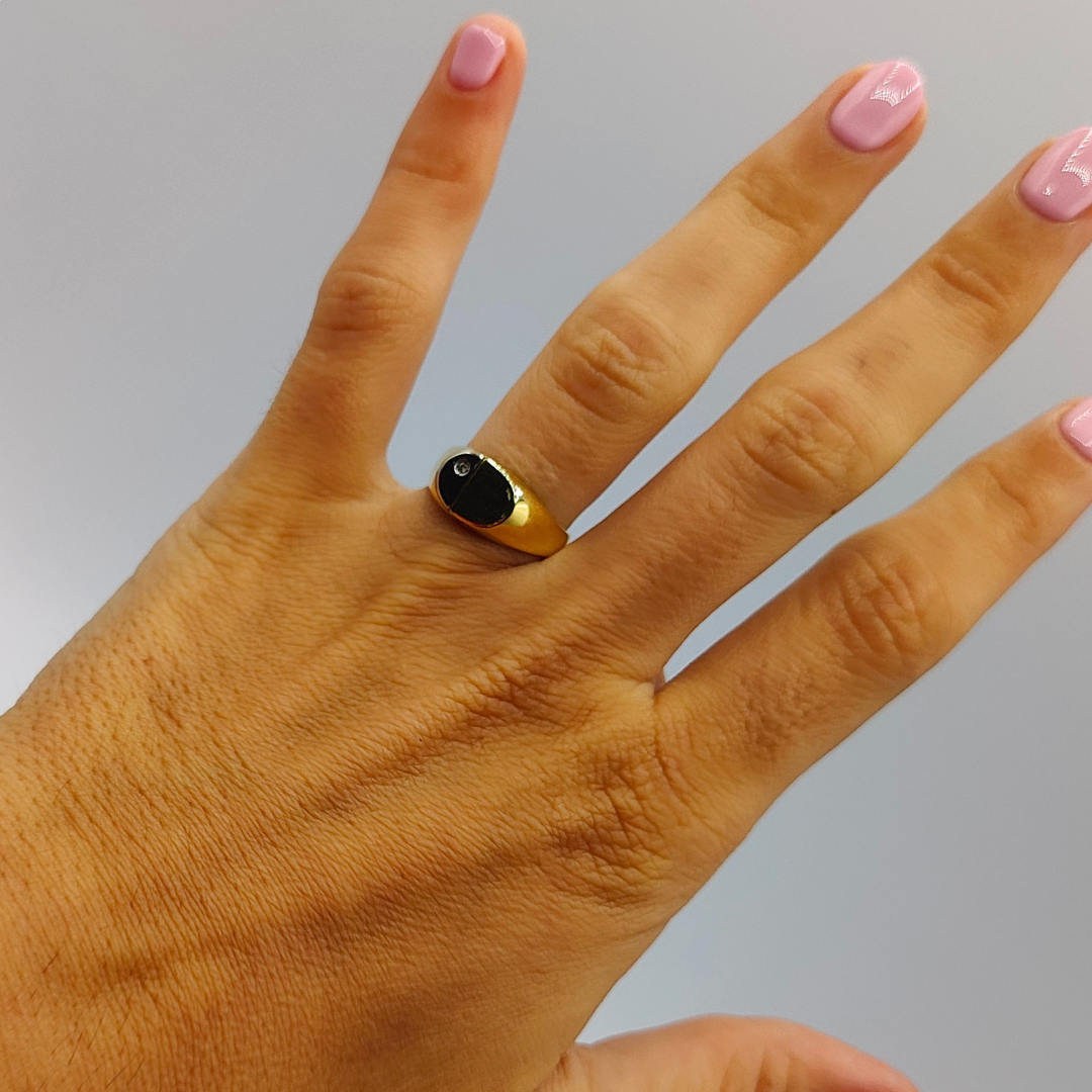 Presentamos nuestro elegante anillo de sello, elaborado en oro de 18 quilates con un refinado toque de oro blanco. En el centro, destaca un delicado diamantito.
