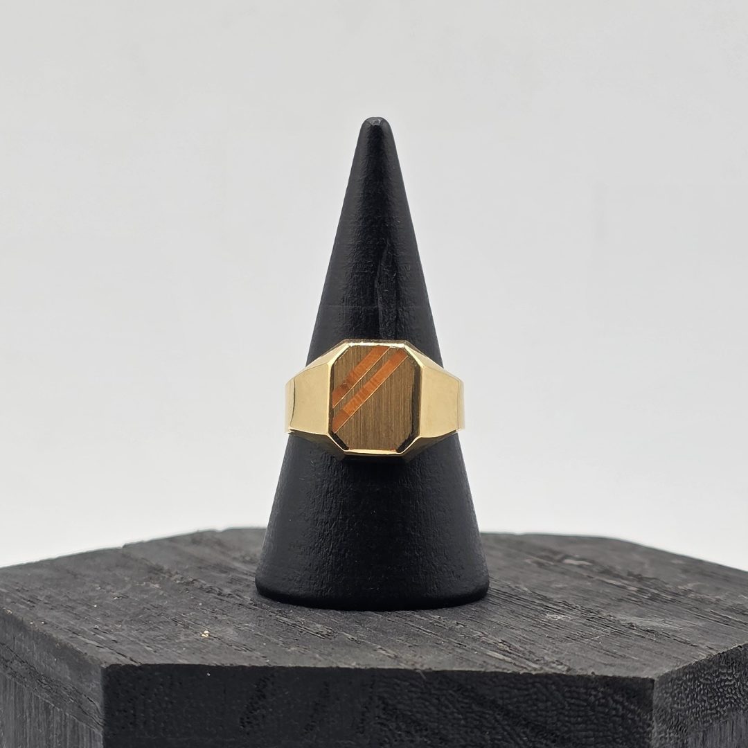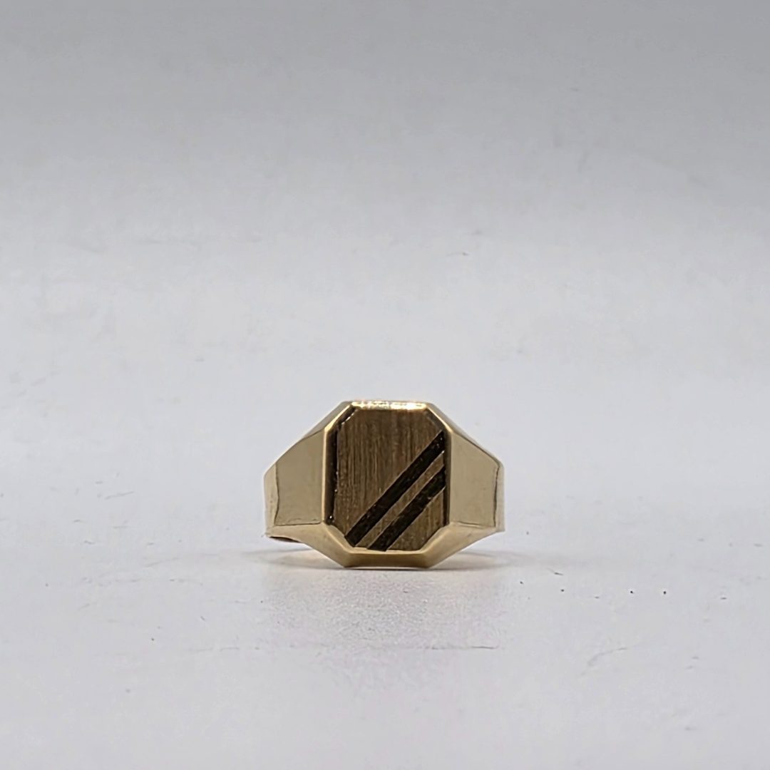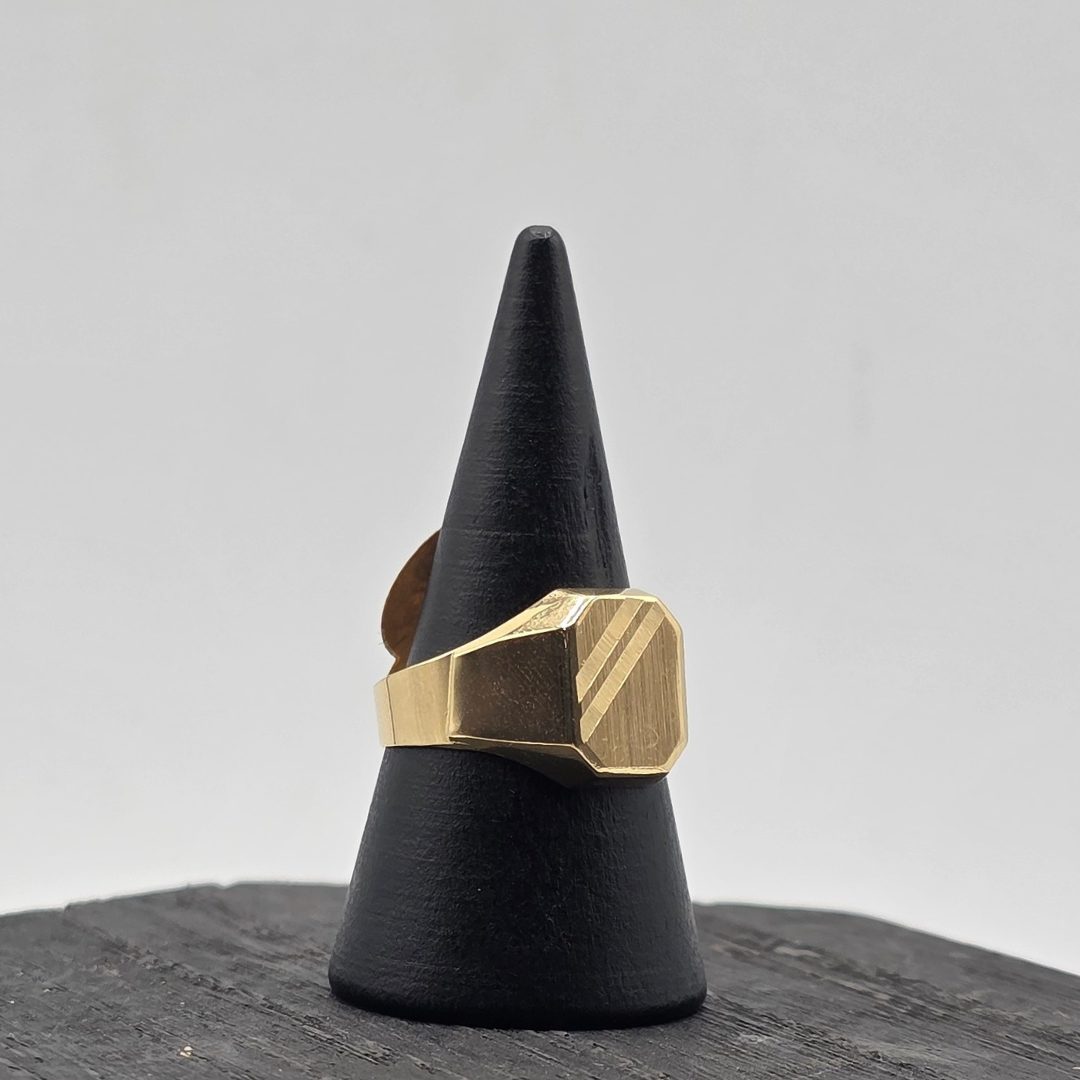 Este elegante anillo sello en oro de 18 quilates presenta un diseño cuadrado y sofisticado, con líneas limpias que resalta su forma moderna y atemporal.