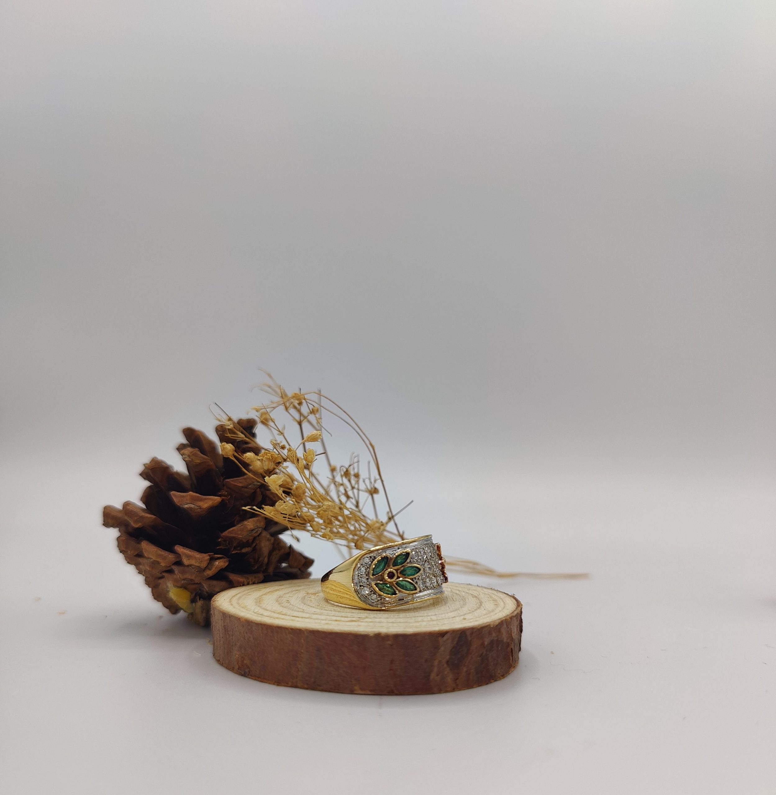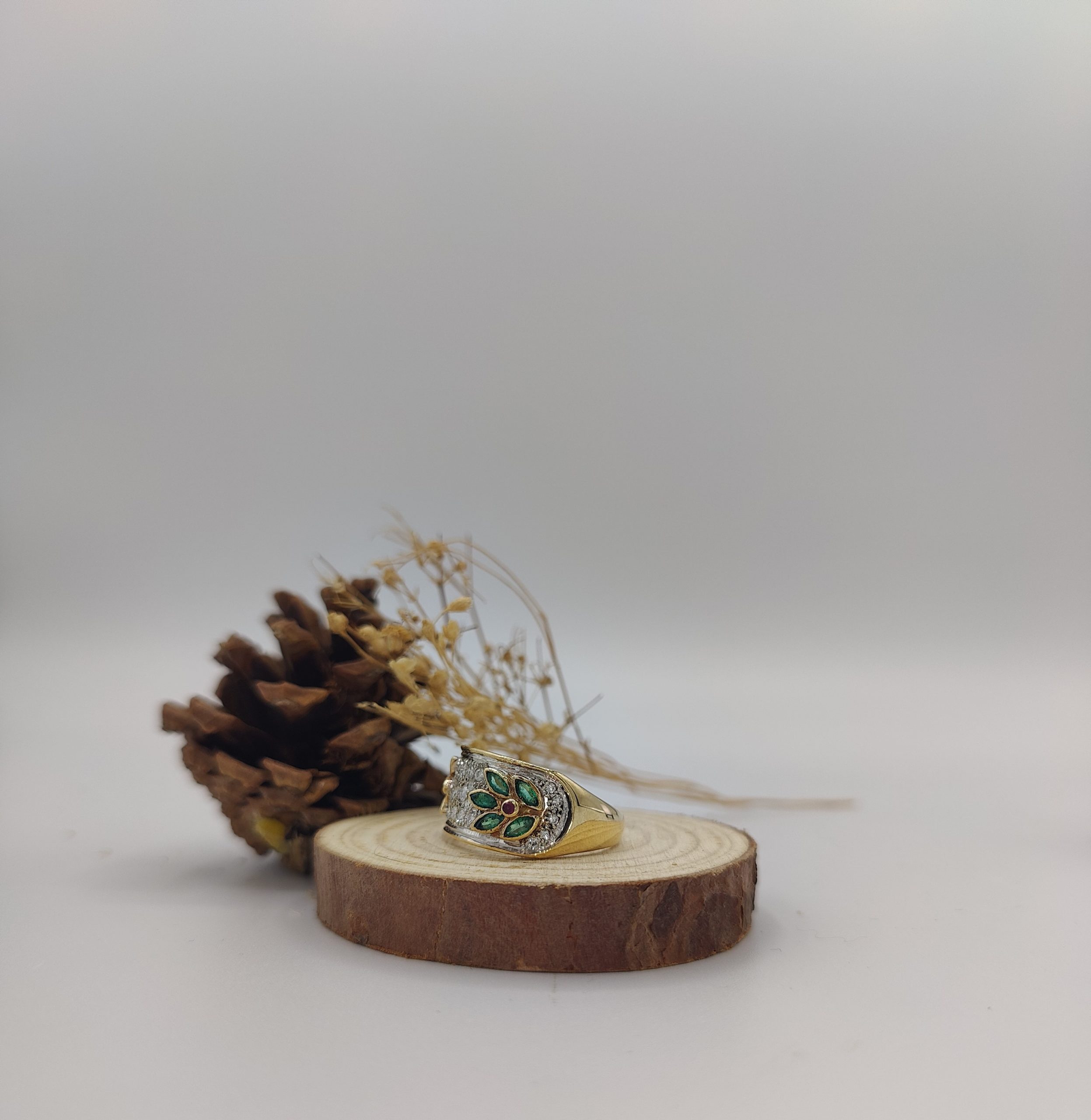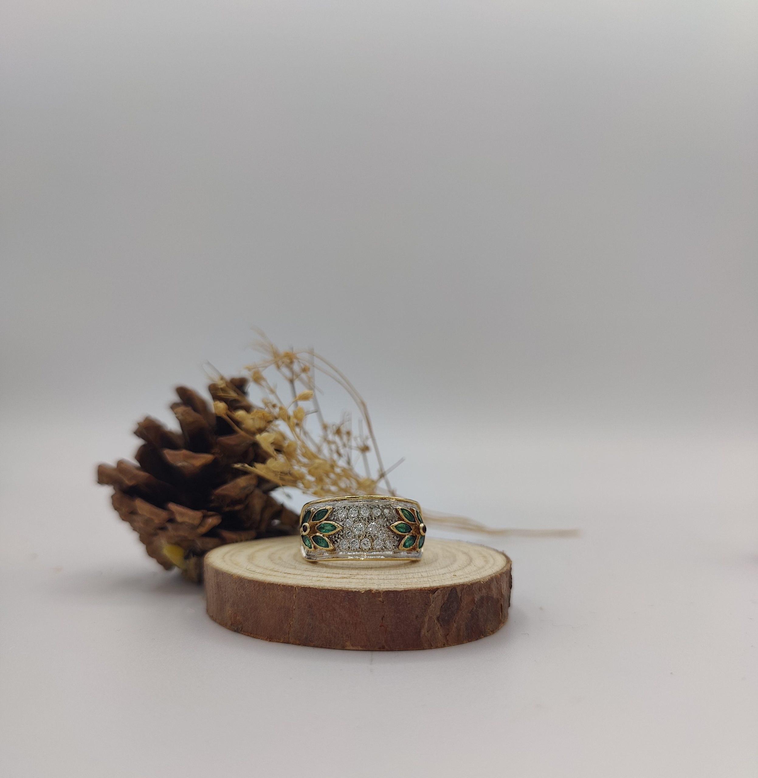 Este impresionante anillo está adornado con una brillante colección de diamantes que capturan la luz de manera deslumbrante. En el centro, dos exquisitas hojas de esmeralda de color verde emergen delicadamente, añadiendo un toque de frescura y naturalidad al diseño. El oro que las rodea proporciona un elegante marco, resaltando su belleza con un brillo cálido y lujoso. Este anillo es una obra maestra de la joyería que combina la sofisticación atemporal con un toque de encanto orgánico.