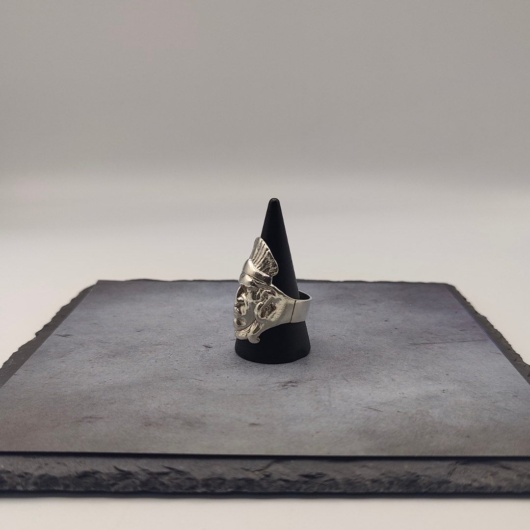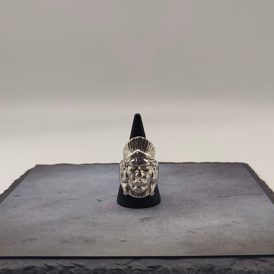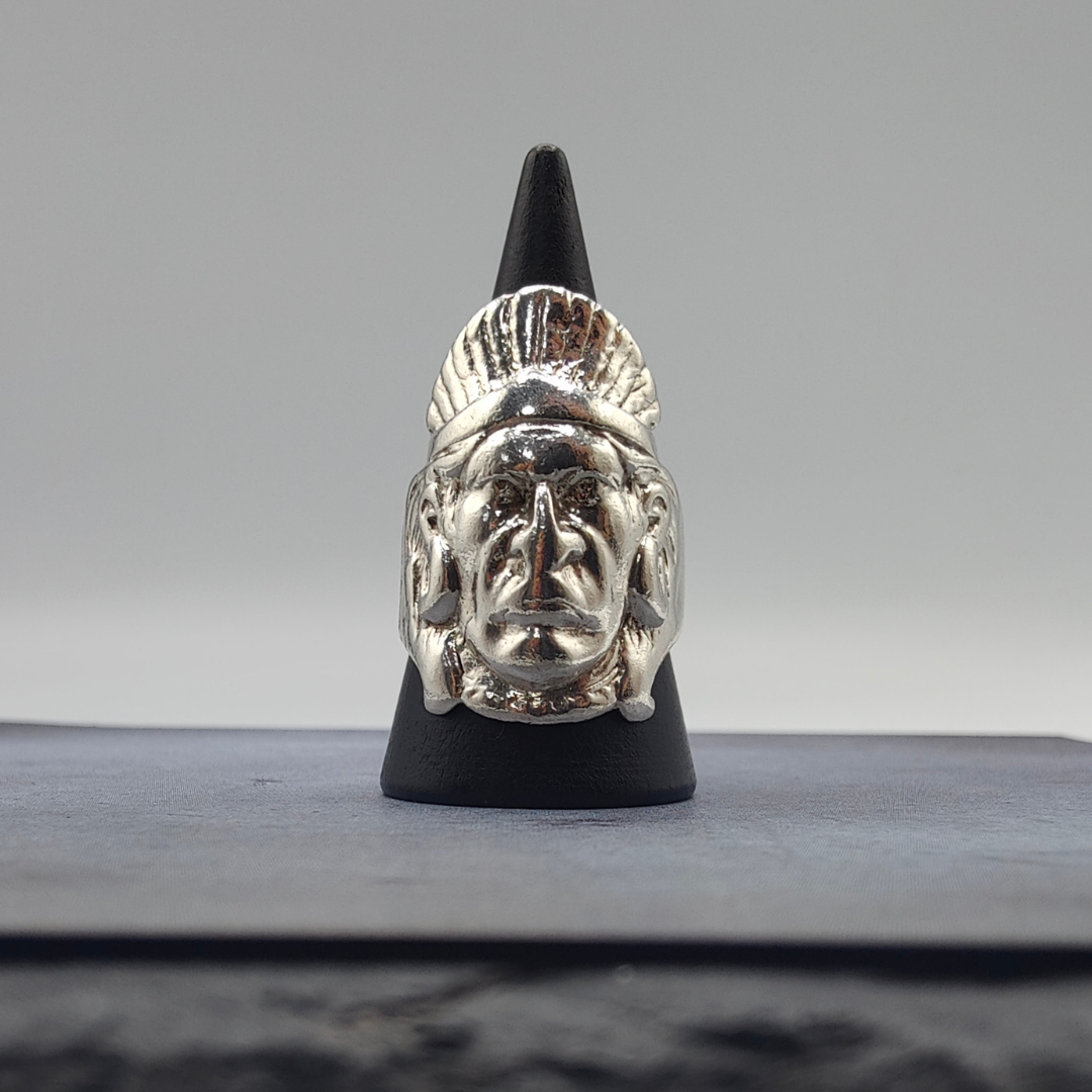 Este anillo de plata con la figura de una cara india es una pieza única y llamativa que fusiona arte y cultura. Su diseño intrincado captura la esencia de la estética indígena.