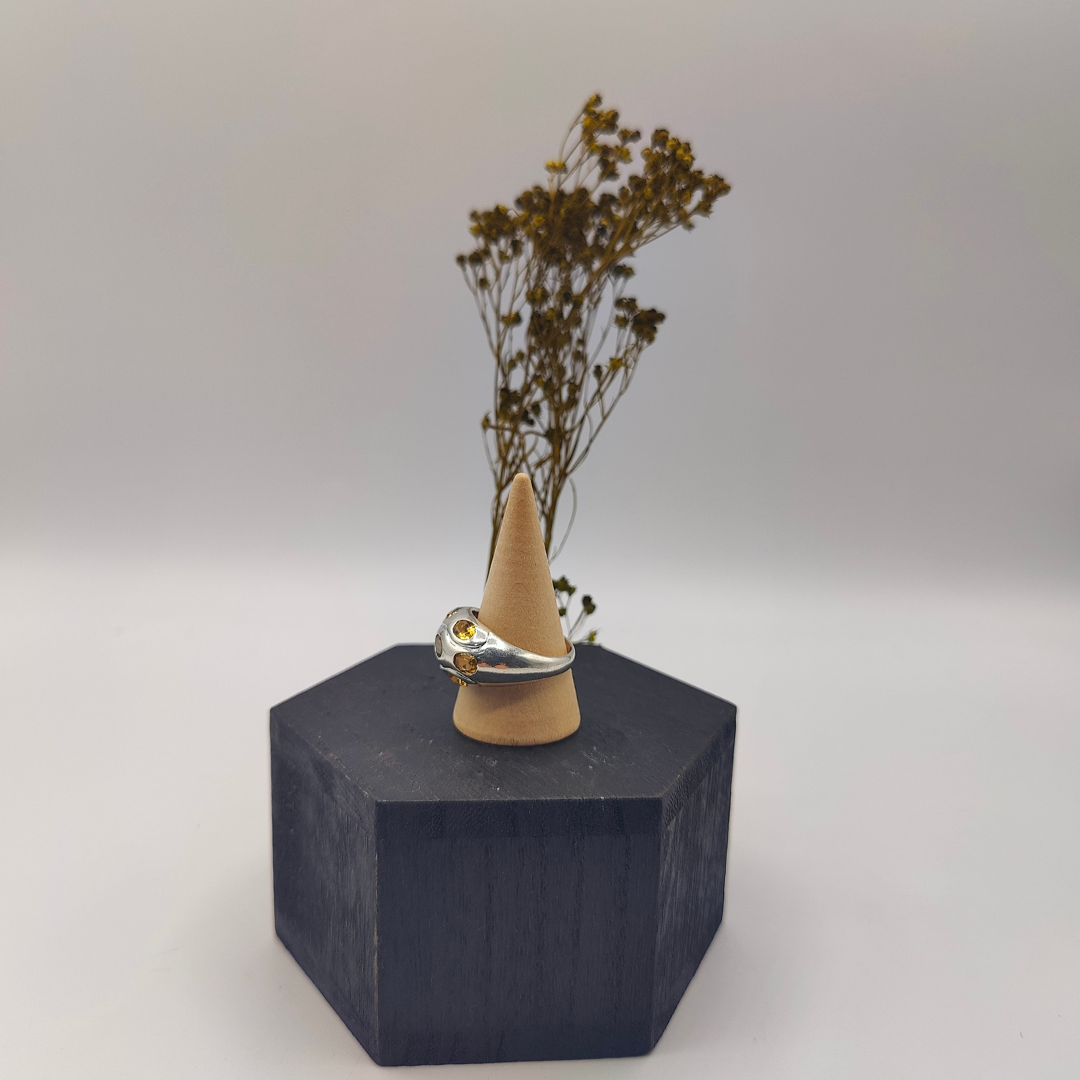 Este elegante anillo abombado presenta un diseño moderno y sofisticado que captura la atención con su forma distintiva. En el centro del anillo, se encuentran unas brillantes circonitas amarilla, engastada con precisión, que aporta un toque de luminosidad y color vibrante.
