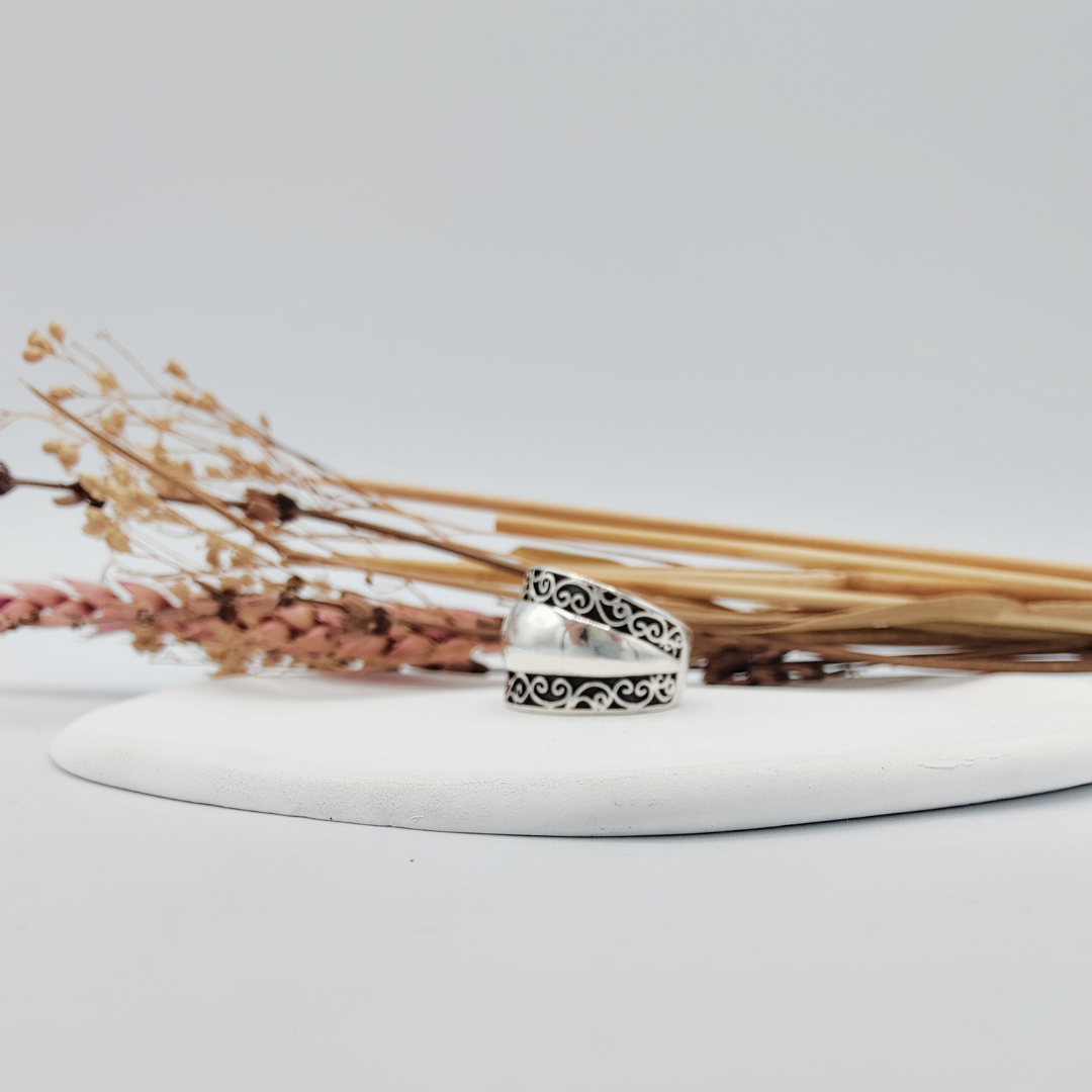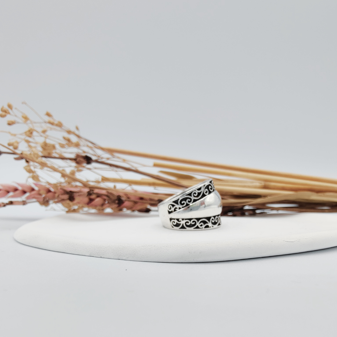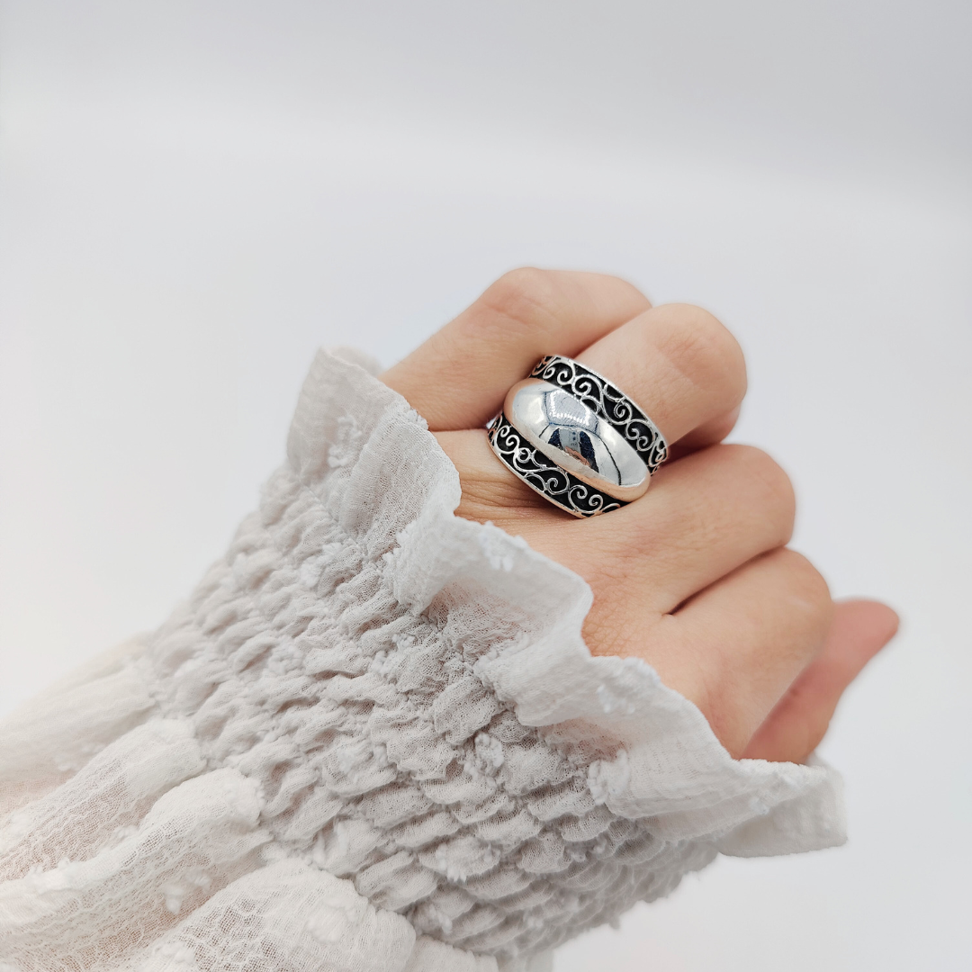 Imagina un anillo vintage abombado de plata, con su superficie curvada que refleja la luz de manera delicada y elegante.