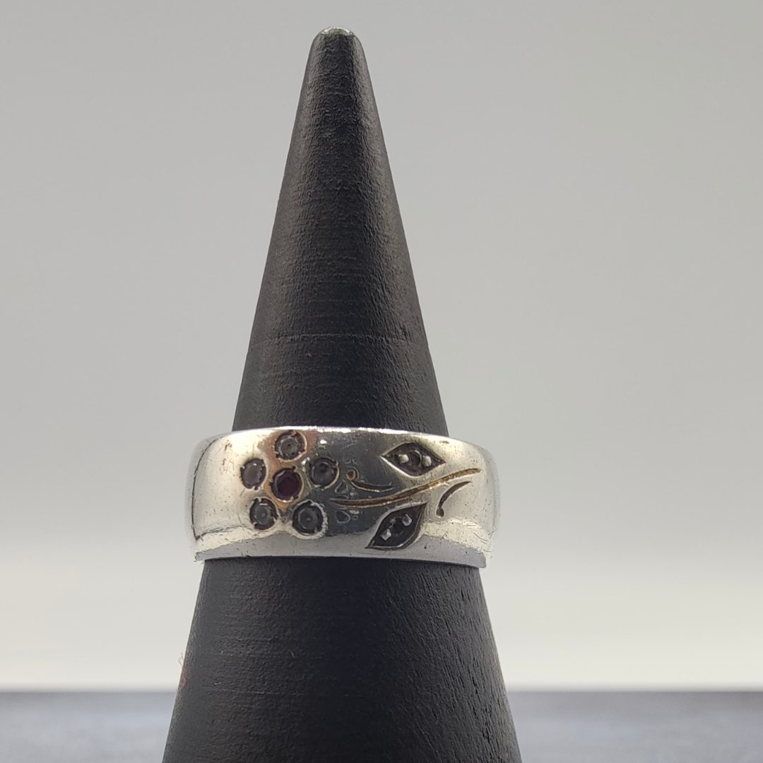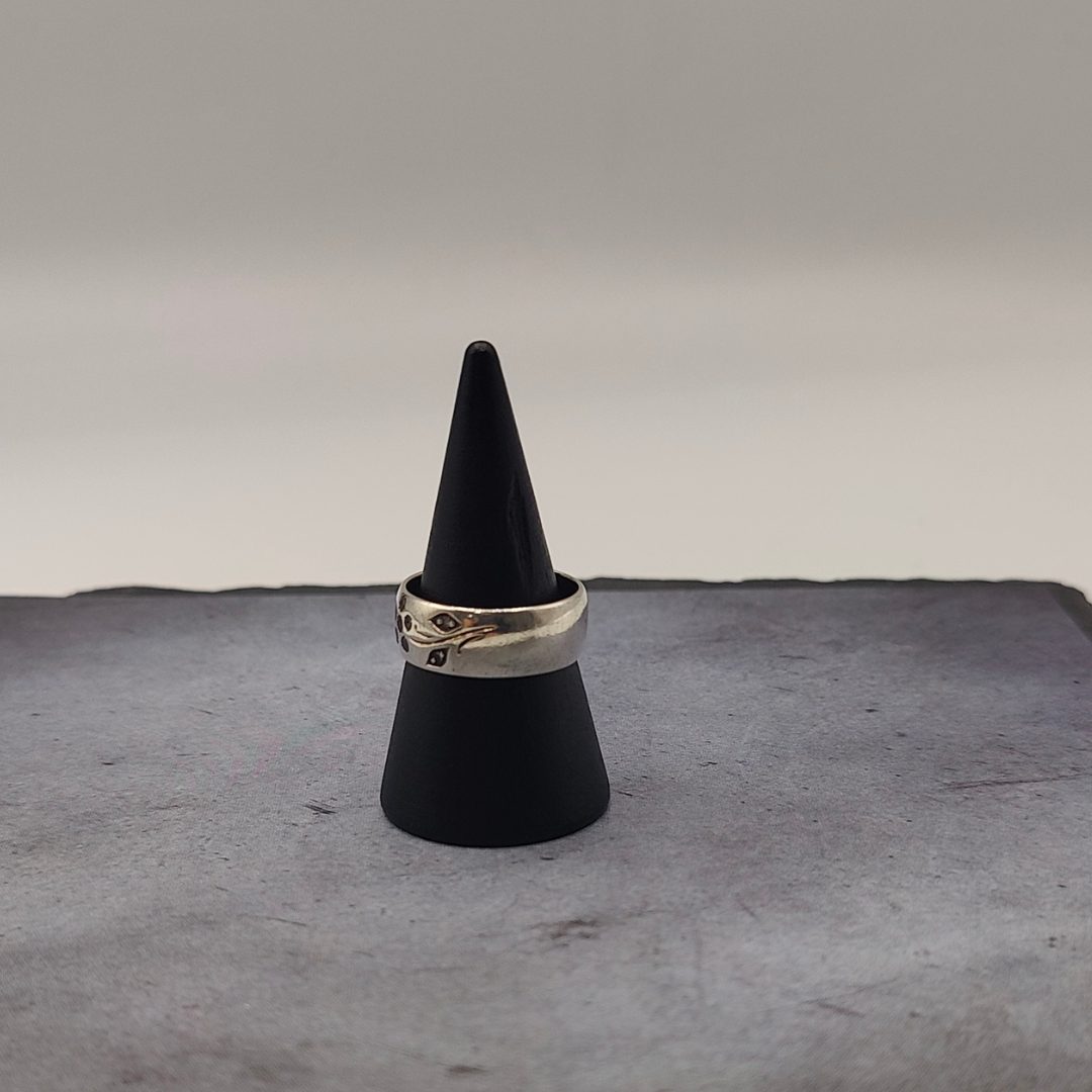 Este anillo de plata con flor grabada y circonitas es una pieza delicada y llena de encanto. El diseño floral, grabado con precisión, aporta un toque de sofisticación.