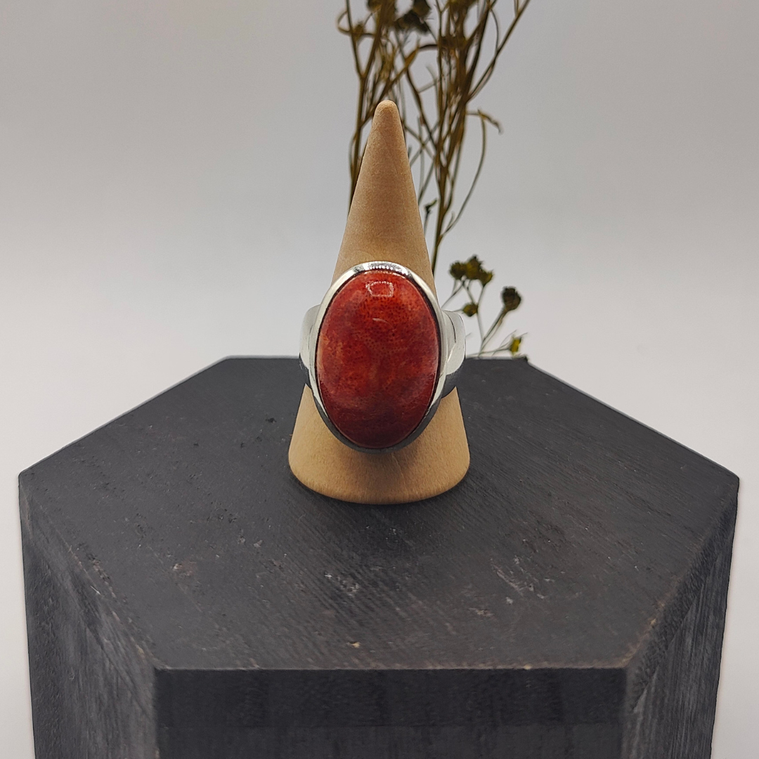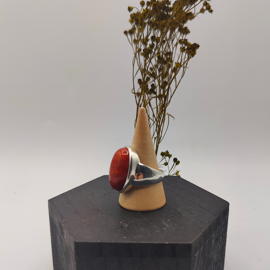 La banda de plata está cuidadosamente pulida, proporcionando un acabado brillante que realza la textura del coral. Su diseño elegante y cómodo asegura que el anillo se ajuste perfectamente al dedo, convirtiéndolo en una pieza ideal para el uso diario o para ocasiones especiales.
