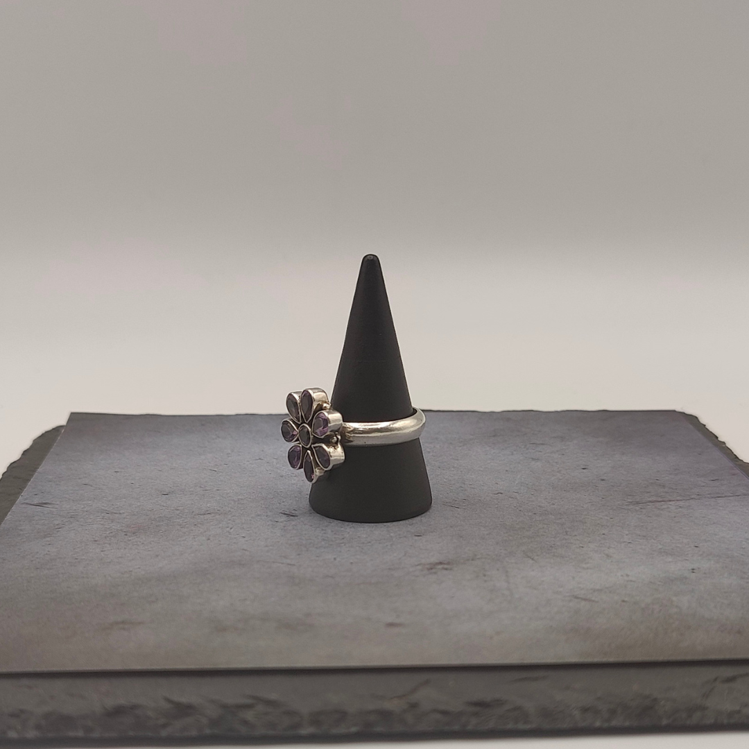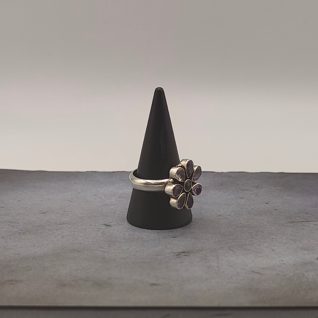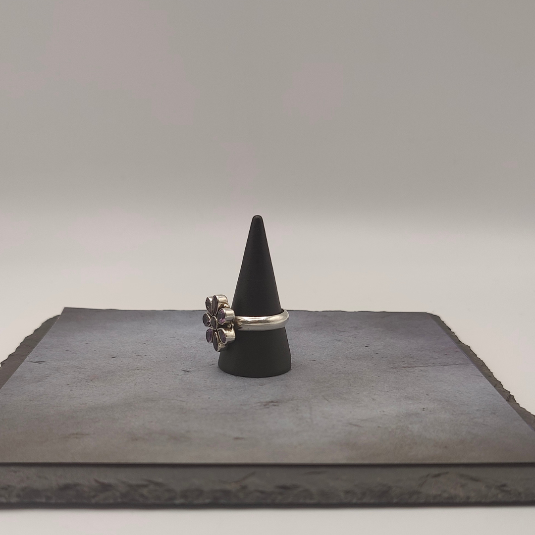 Exquisito anillo en forma de flor, elaborado en plata de ley y adornado con deslumbrantes amatistas que aportan un toque de color vibrante.