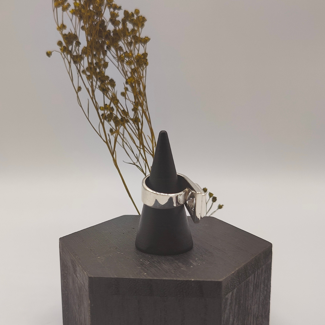 Este impresionante anillo de plata destaca por su diseño elegante y moderno, que incorpora una lengueta distintiva que le confiere un carácter único.