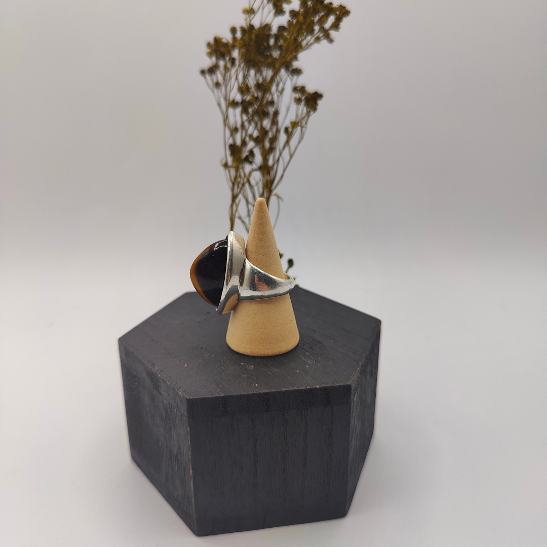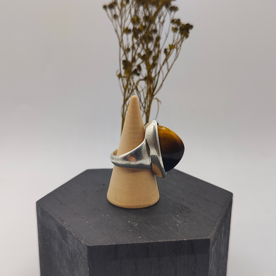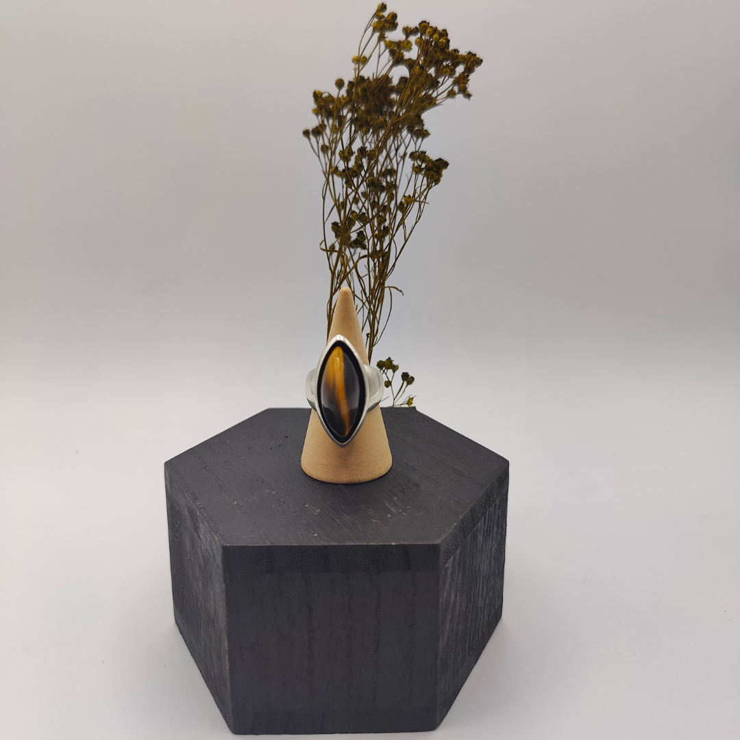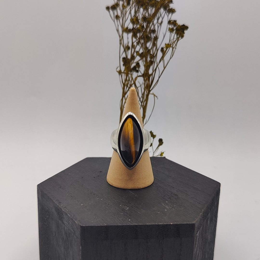 Este elegante anillo de plata presenta una singular piedra de ojo de tigre tallada en forma de barco, lo que lo convierte en una pieza de joyería verdaderamente única y llamativa. El ojo de tigre, conocido por su fascinante juego de colores que varía desde el dorado hasta el marrón oscuro, es una piedra preciosa que se asocia con la protección y la confianza.