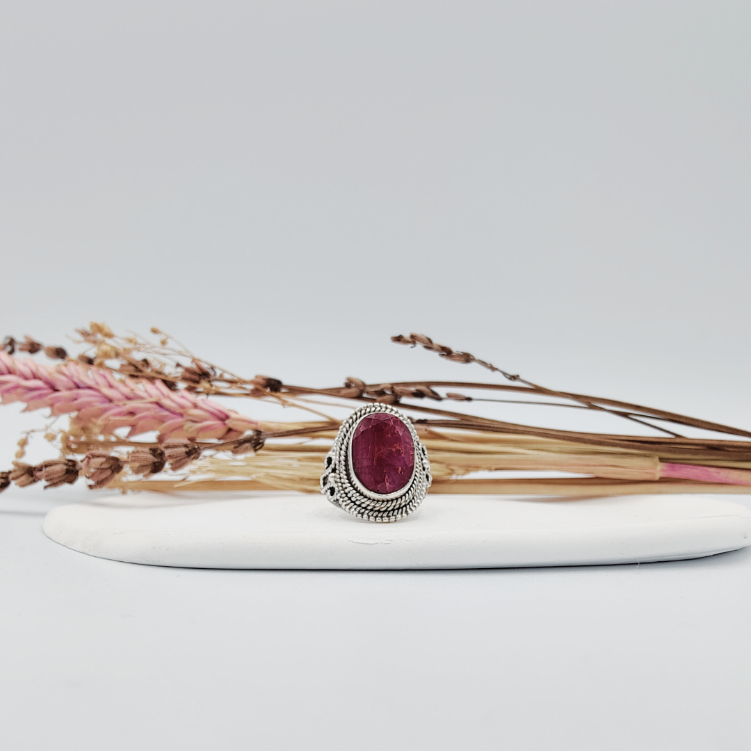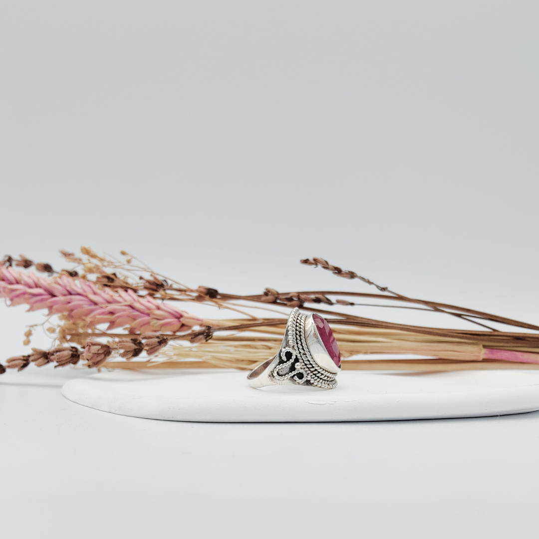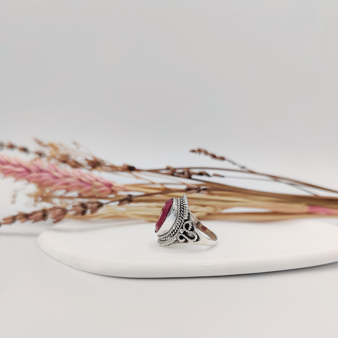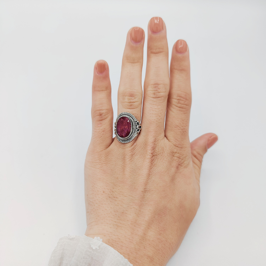 ¡Descubre esta joya única! Presentamos este impresionante anillo vintage con un rubí natural grande como pieza central. Su diseño elaborado y detallado evoca la elegancia de épocas pasadas.