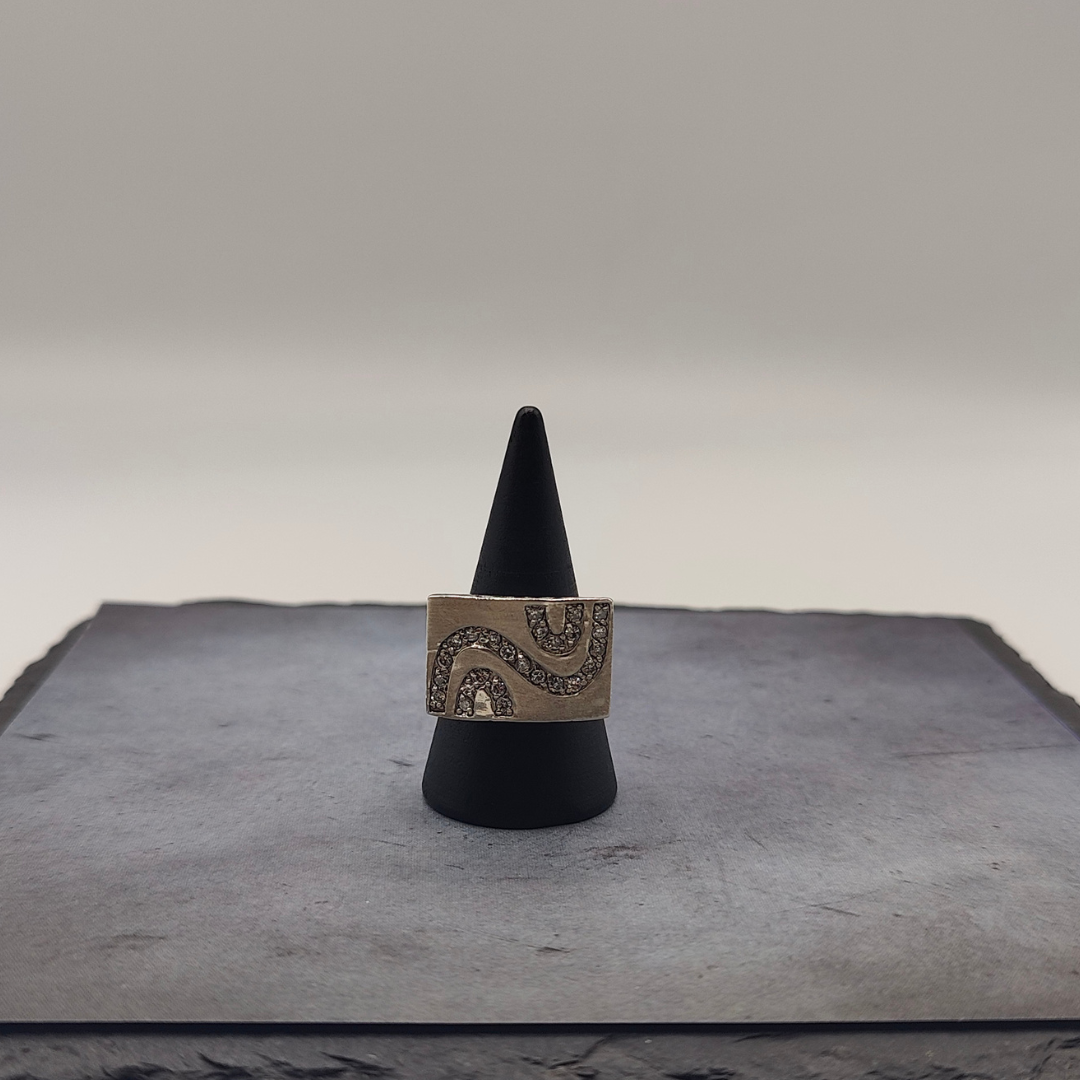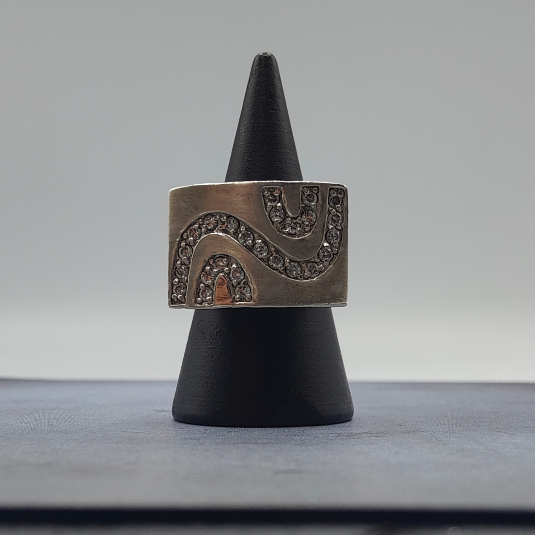 Este anillo sello de plata con cenefa de circonitas es una joya de estilo clásico y elegante. El diseño del anillo presenta una estructura sólida y refinada