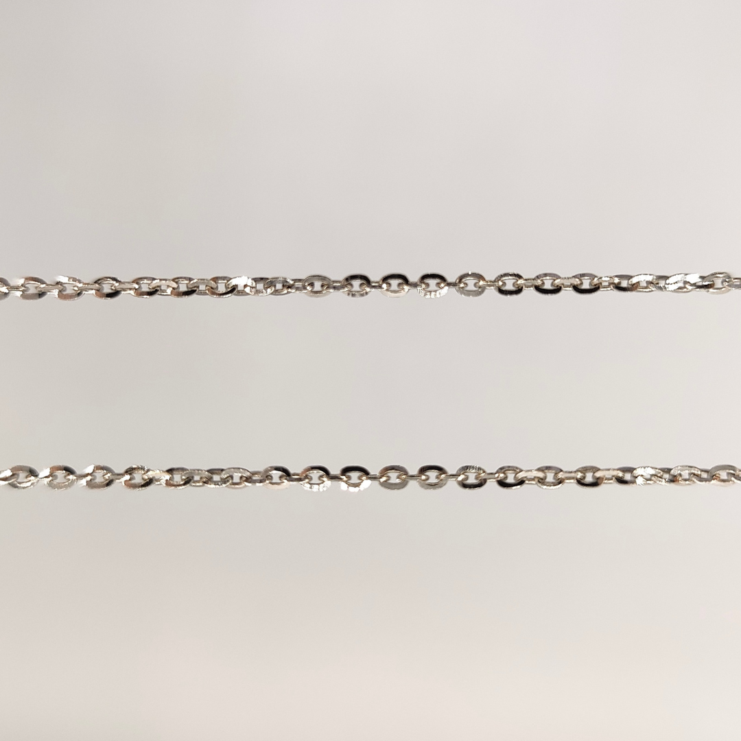 Fabricada con oro blanco de 18 quilates, esta cadena resalta por su acabado brillante que realza su belleza natural y asegura su durabilidad. Es una elección perfecta para quienes aprecian la calidad excepcional y buscan una pieza de joyería que combine estilo contemporáneo con un toque de lujo.