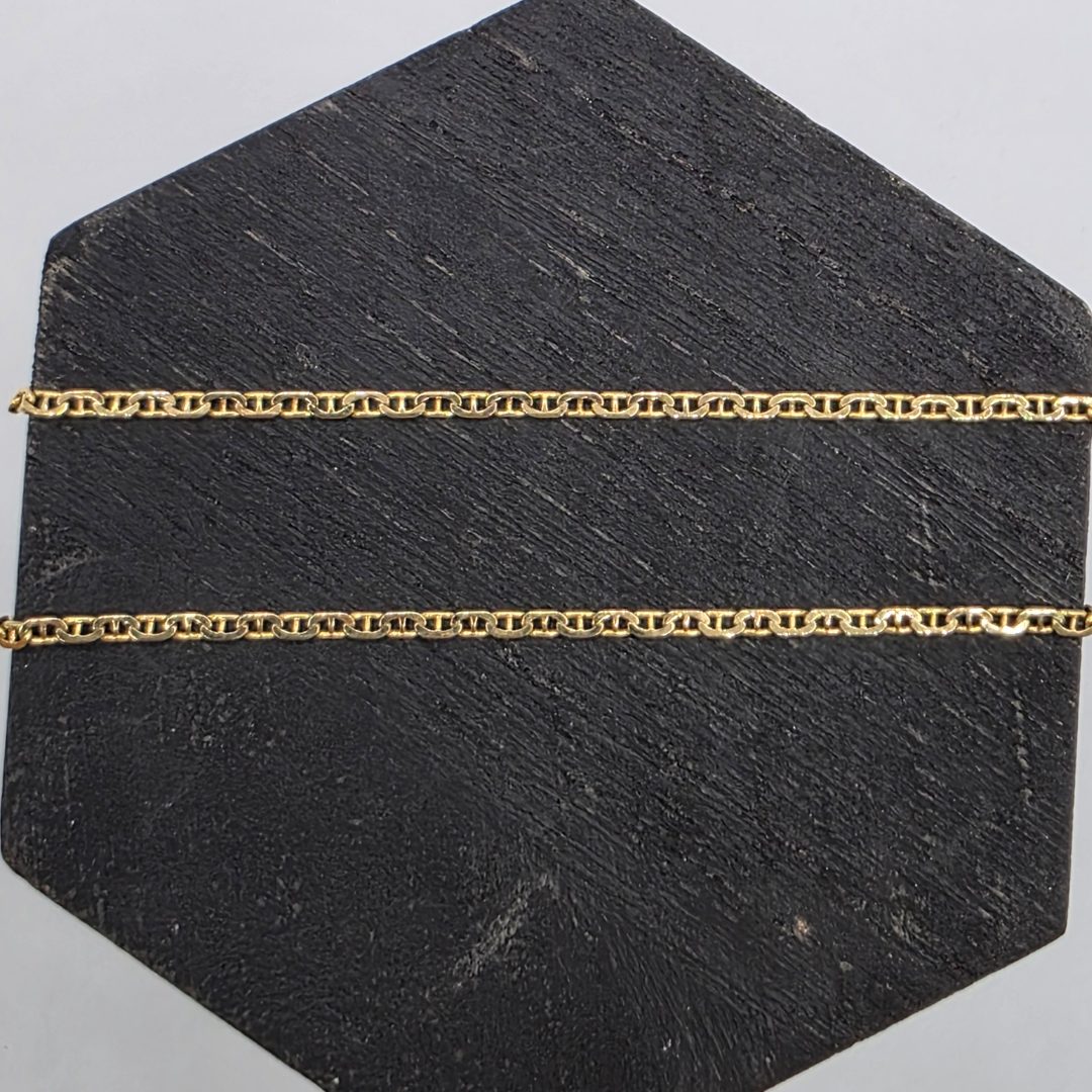 Esta cadena barbada en oro de 18 quilates presenta un diseño clásico y elegante, con eslabones planos que se alternan para crear un patrón distintivo y sofisticado.