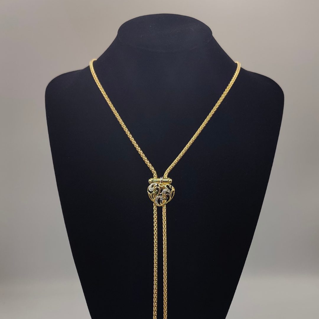 Este impresionante diseño presenta eslabones tipo serpiente que se entrelazan con elegancia, creando un acabado suave y brillante. El cierre en forma de corazón, adornado con circonitas, añade un toque romántico y sofisticado, mientras que el final de la cadena se destaca con dos borlas, una de ellas embellecida con circonitas, que aportan un brillo adicional.
