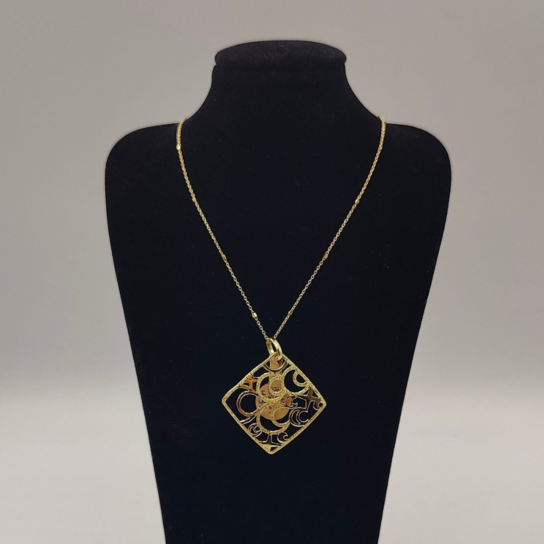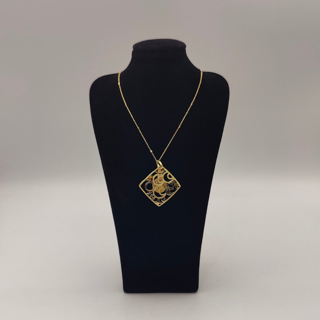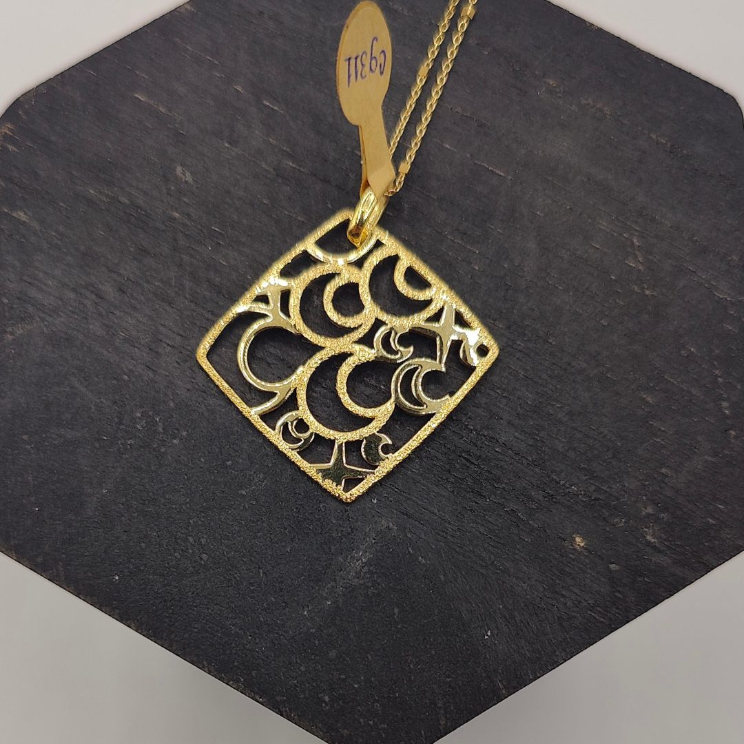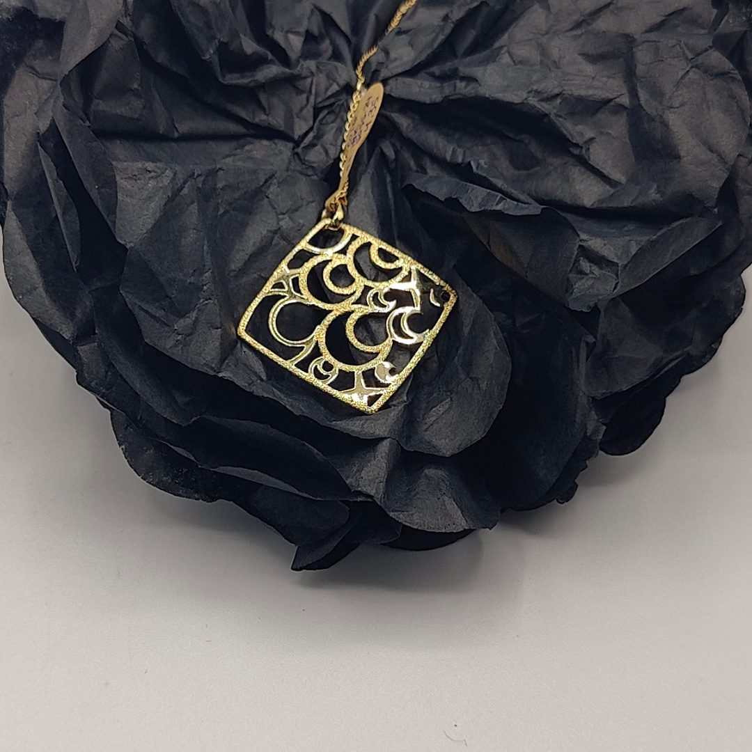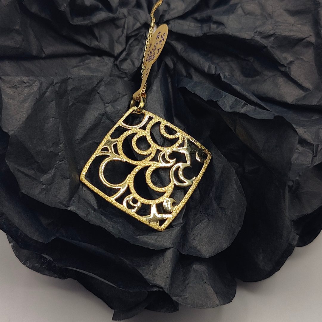Este elegante colgante presenta un diseño cuadrado con detalles de lunas caladas en su interior, creando un juego de luz y sombras que lo hace destacar. El acabado en oro de 18 quilates le proporciona un brillo excepcional y una durabilidad inigualable. Ideal para quienes buscan una pieza de joyería moderna con un toque distintivo, este colgante es perfecto para cualquier ocasión.