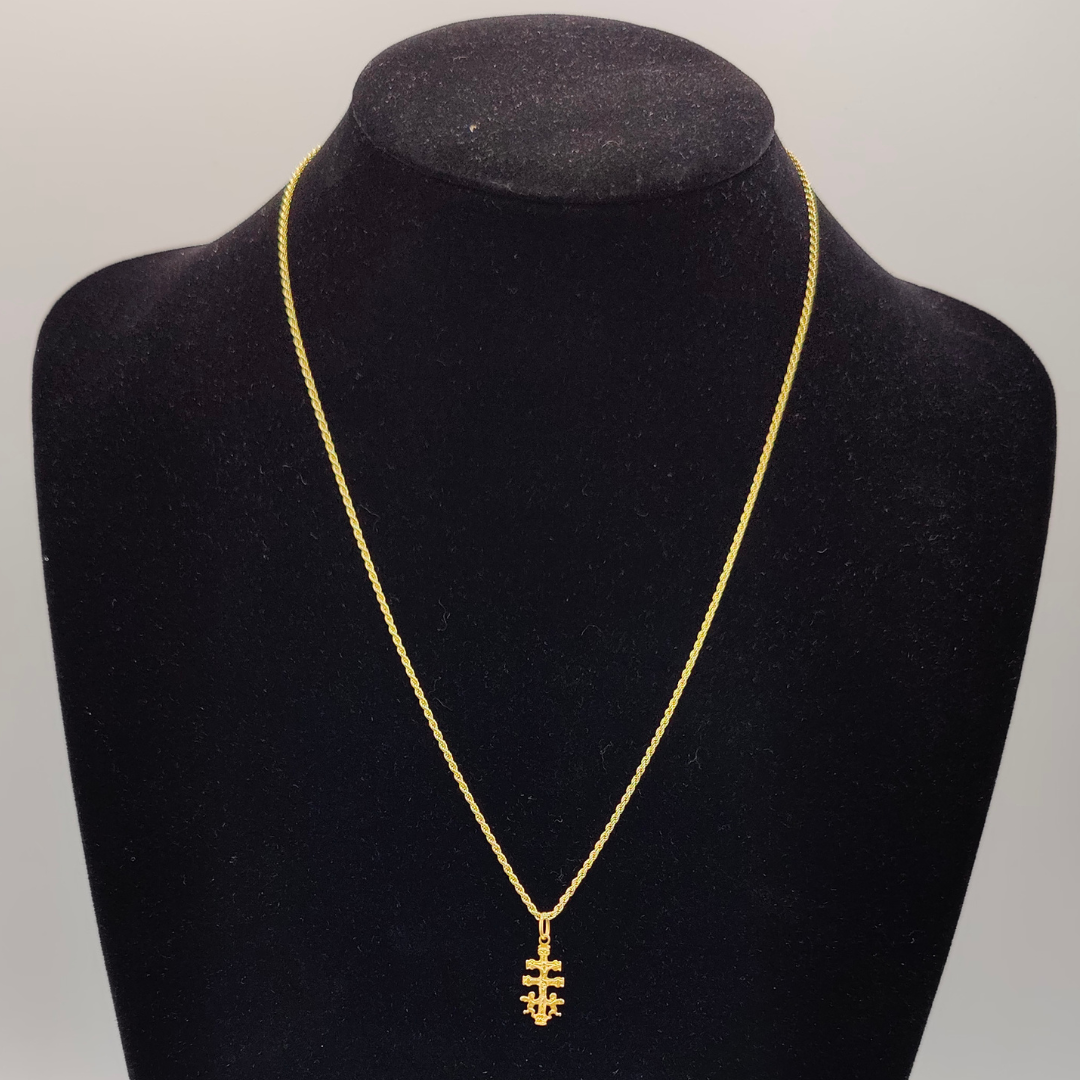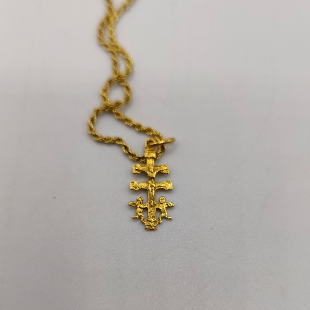 Este exquisito colgante de cruz de Caravaca, elaborado en oro de 18 quilates, es una joya de profunda significación espiritual y belleza.