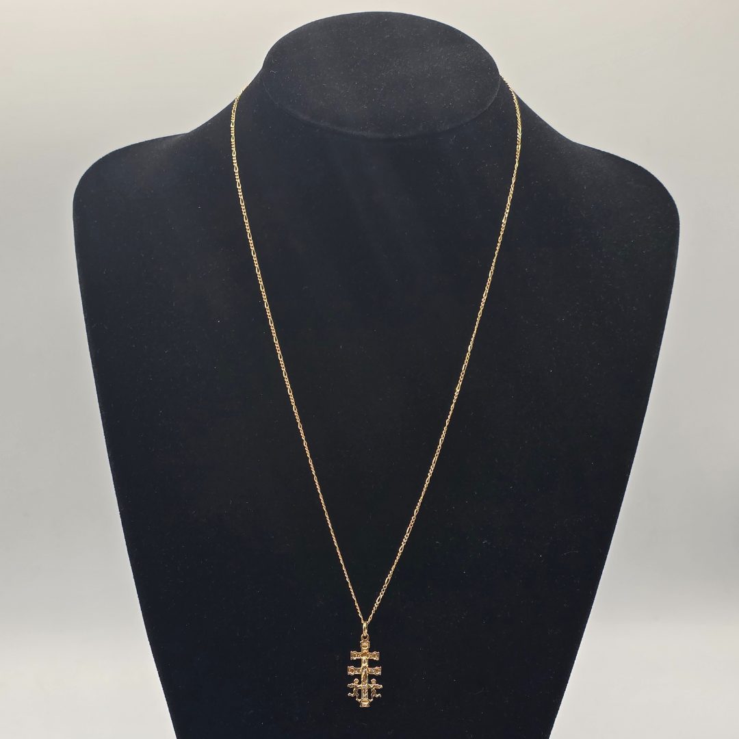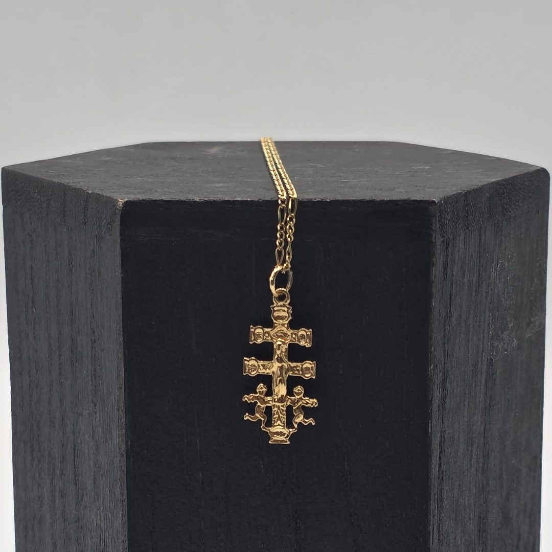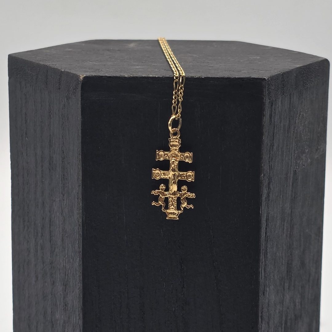 Esta medalla de la Cruz de Caravaca en oro de 18 quilates presenta un diseño tradicional y simbólico, que representa la fe y protección.