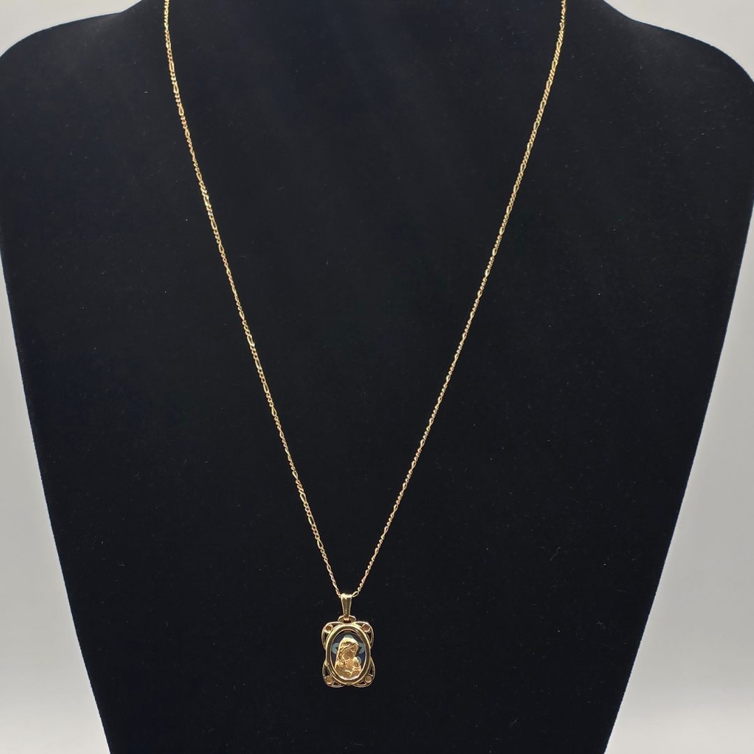Esta medalla en oro de 18 quilates presenta, en un lado, la imagen de Jesús del Sagrado Corazón y, en el reverso, la Virgen del Carmen, ambas exquisitamente grabadas con un diseño trocado que alterna entre detalles finos y elegantes.