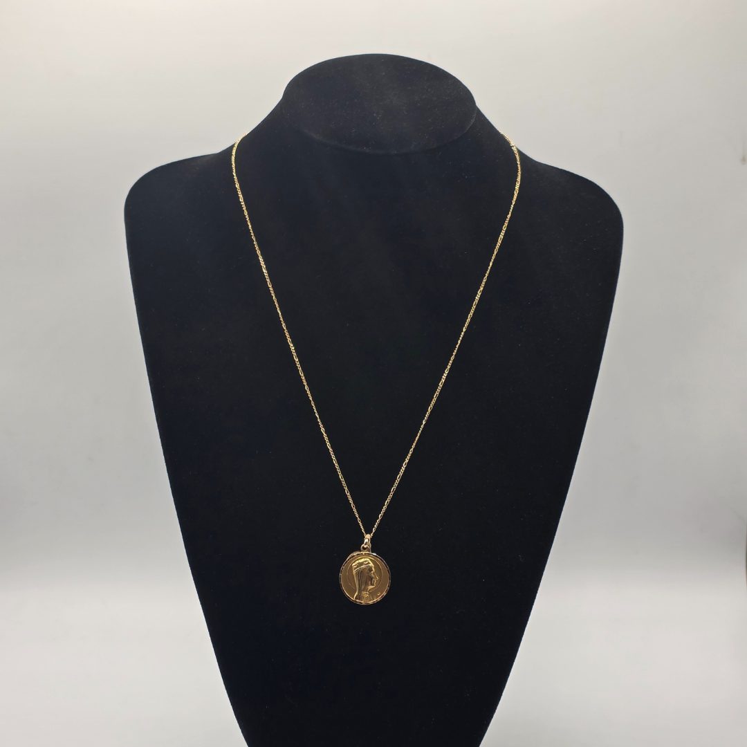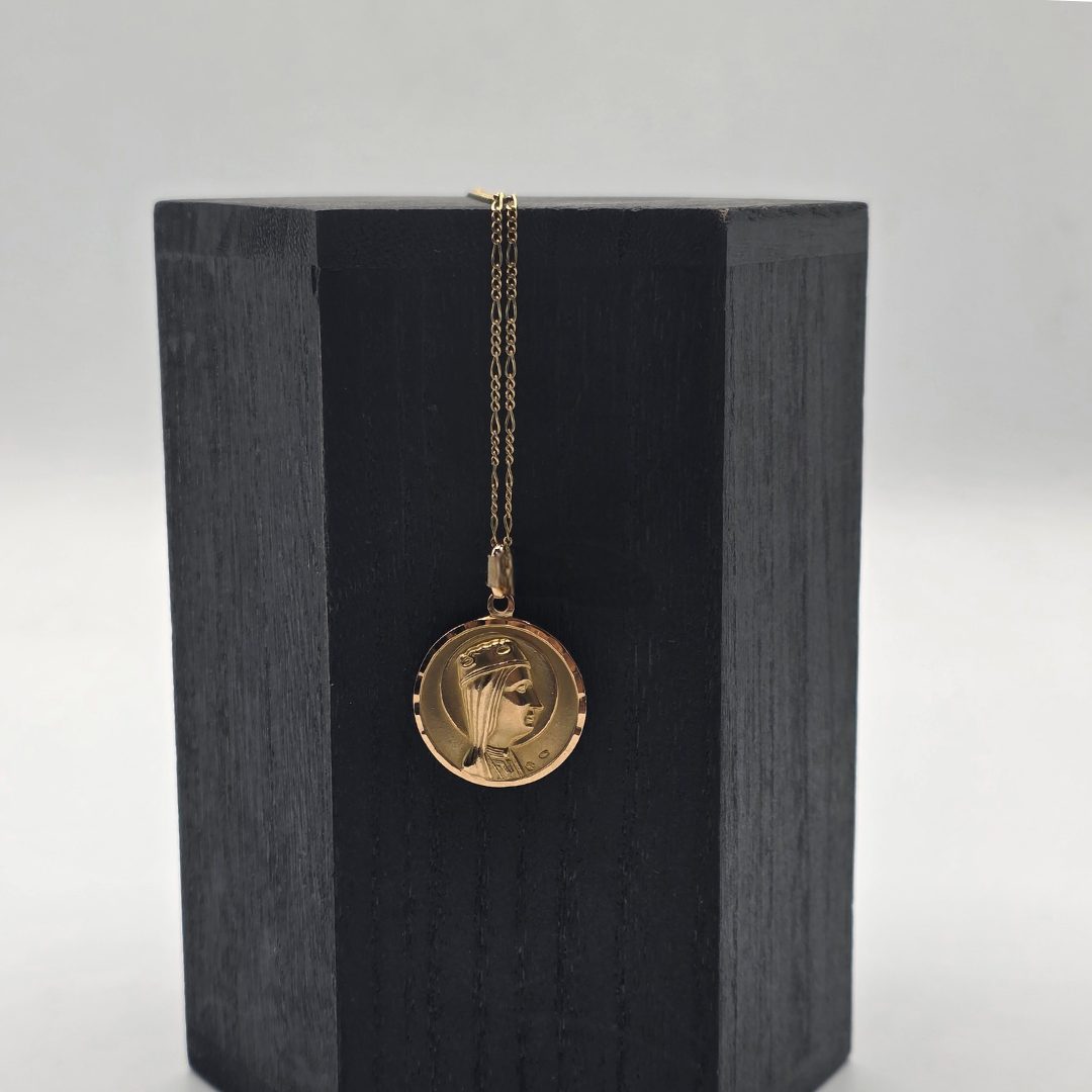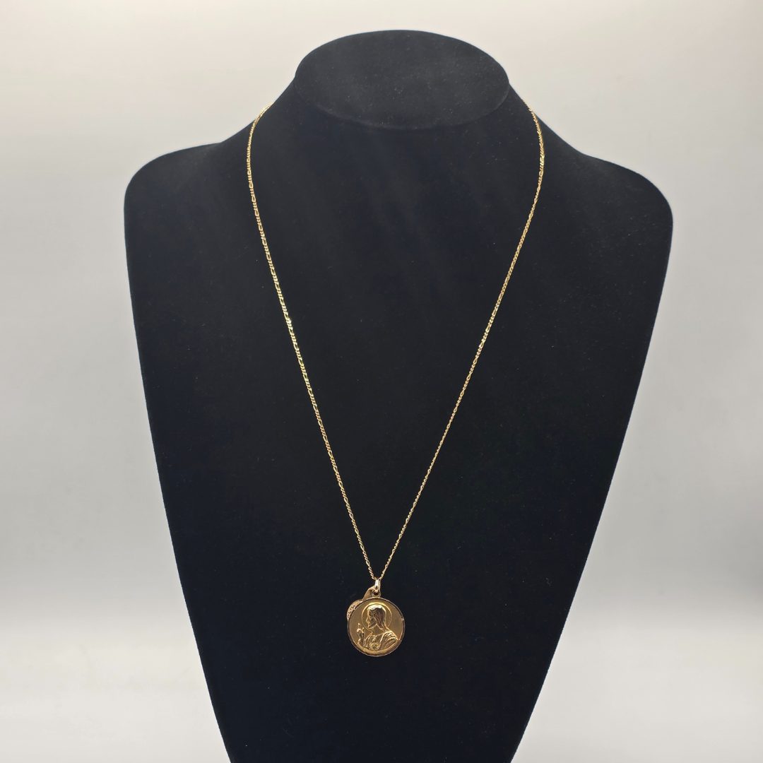 Esta medalla en oro de 18 quilates presenta una imagen de la Virgen de Montserrat en un lado y, en el reverso, la figura de Jesús del Sagrado Corazón.