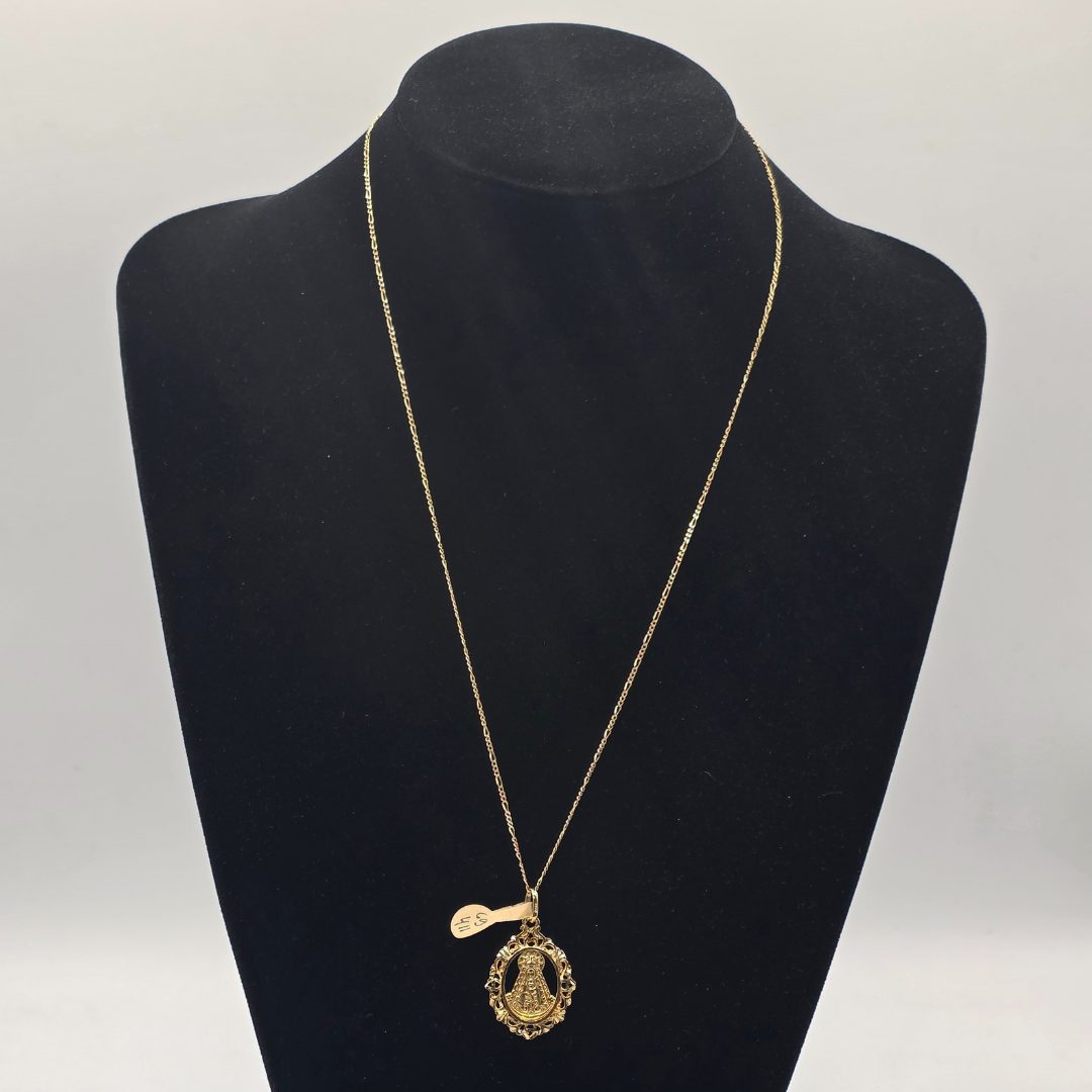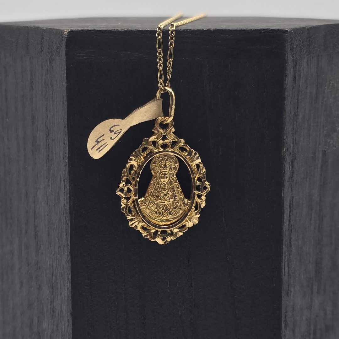 Esta medalla en oro de 18 quilates presenta la imagen de la Virgen del Rocío, una figura profundamente venerada en la tradición religiosa española.