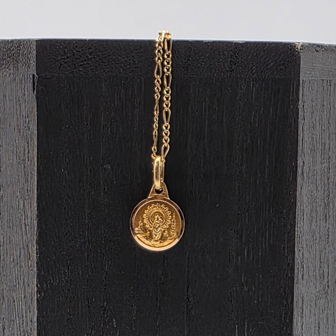 Esta delicada mini medalla en oro de 18 quilates presenta una imagen de la Virgen, esculpida con detalle y refinamiento. Su tamaño compacto la hace perfecta para quienes buscan una joya sutil pero significativa.