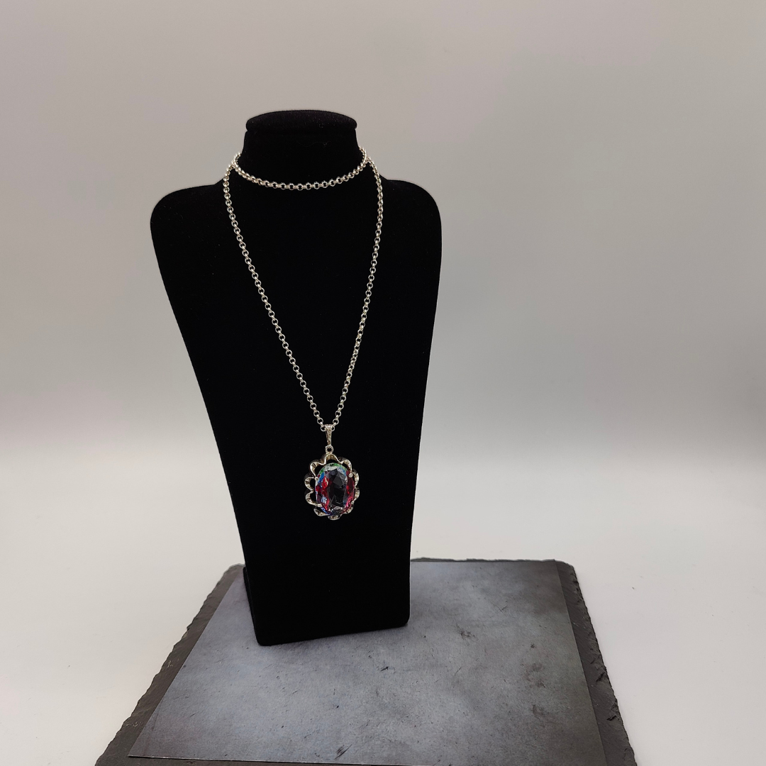 Encantador colgante de plata de ley con una circonita iridiscente que refleja un caleidoscopio de colores. La piedra, con un brillo cambiante y vibrante