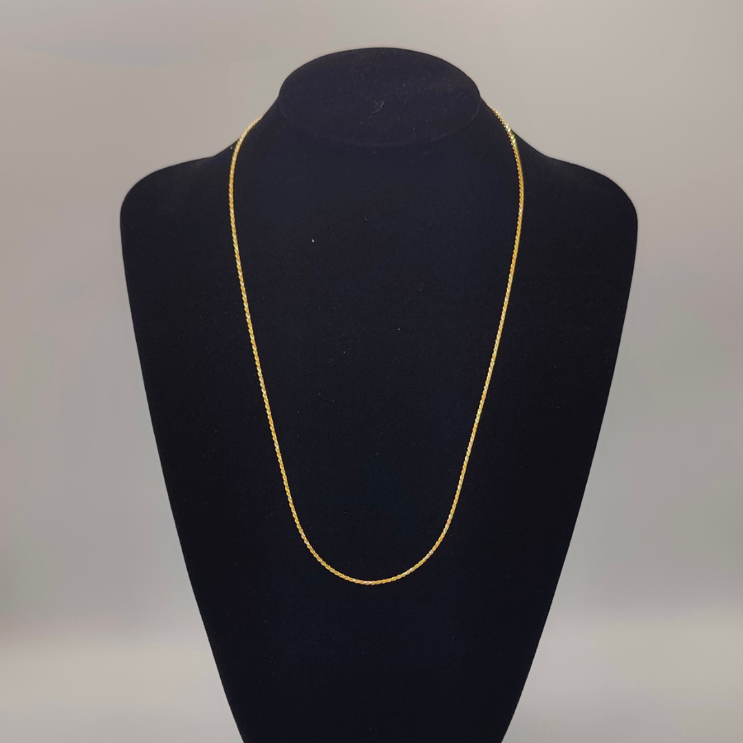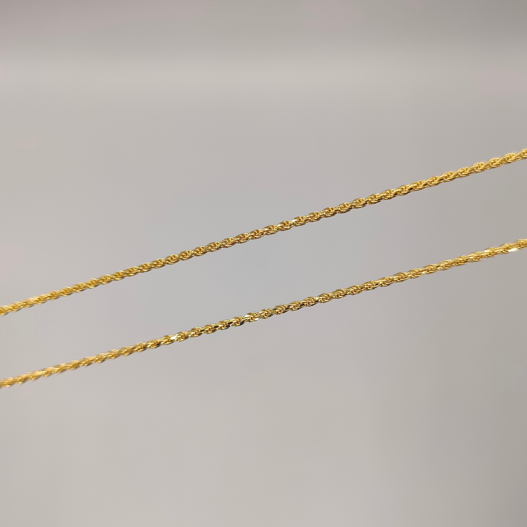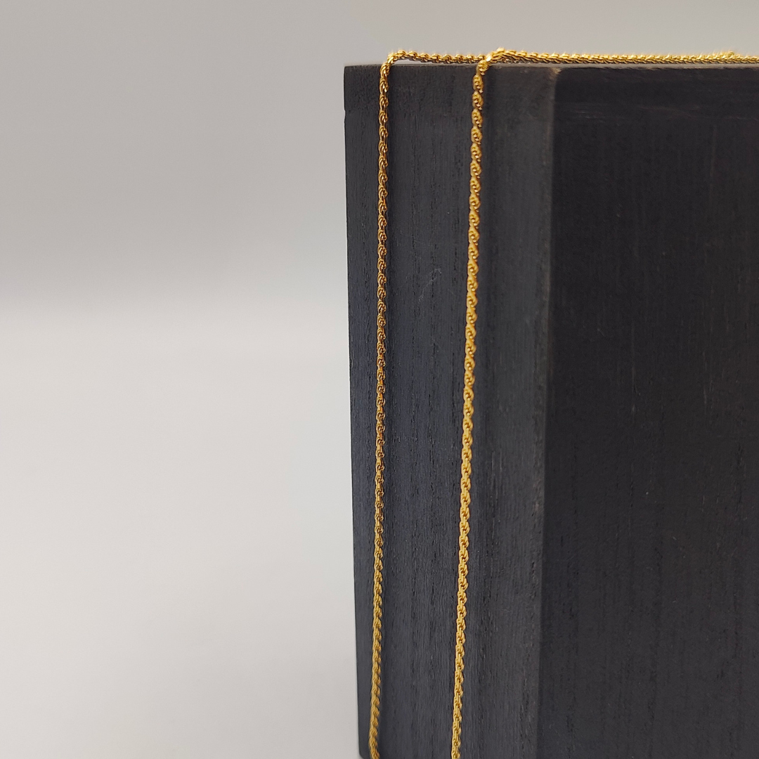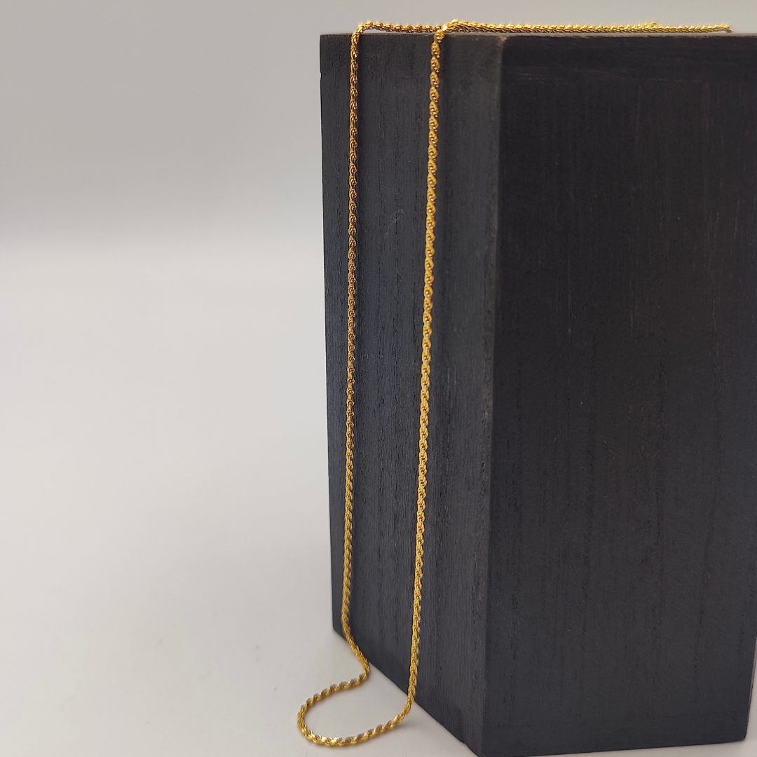 Sutil y elegante, esta cadena tipo cordón de 60 cm de largo y 1 mm de grosor es perfecta para quienes aprecian la delicadeza en los detalles. Fabricada en oro de 18 quilates, su diseño refinado la convierte en un accesorio versátil, ideal para llevar solo o acompañado de un dije pequeño. Su ligereza y brillo distintivo la hacen una elección clásica