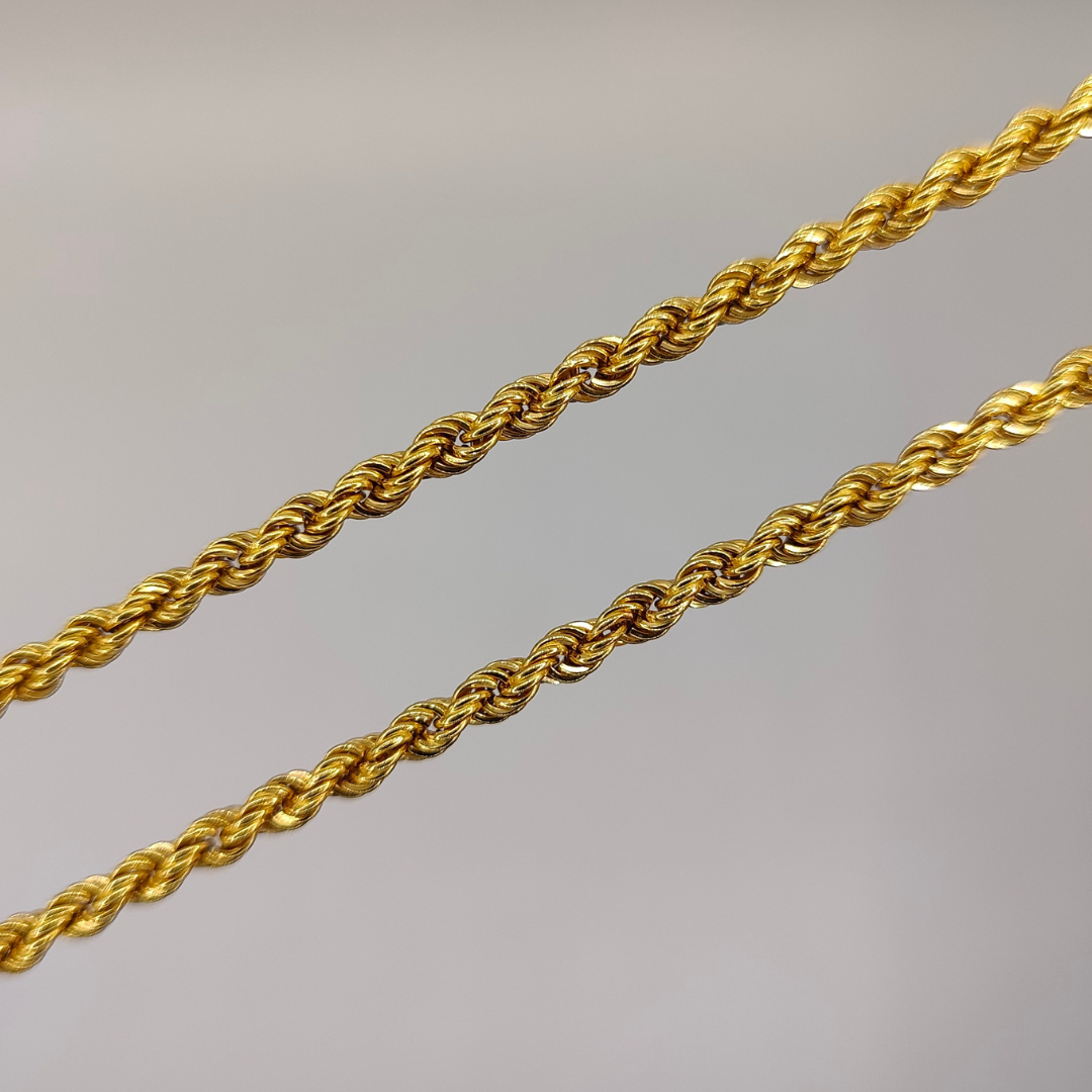 Esta cadena de 18 kilates tipo cordón de 55 cm y 3 mm es una joya exquisita que combina elegancia y sofisticación en una pieza única. Su diseño trenzado crea una textura rica y atractiva que captura y refleja la luz con cada movimiento, realzando el hermoso resplandor del oro. Con su longitud perfecta, se posa delicadamente sobre el cuello, añadiendo un toque de lujo y refinamiento a cualquier atuendo. Es la elección ideal para quienes buscan una joya que transmita tanto estilo como distinción, perfecta para realzar la belleza natural de quien la lleve.