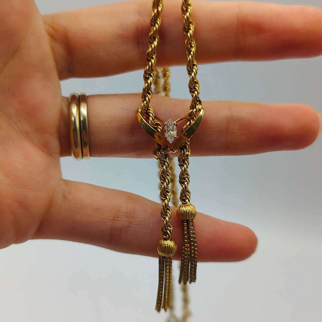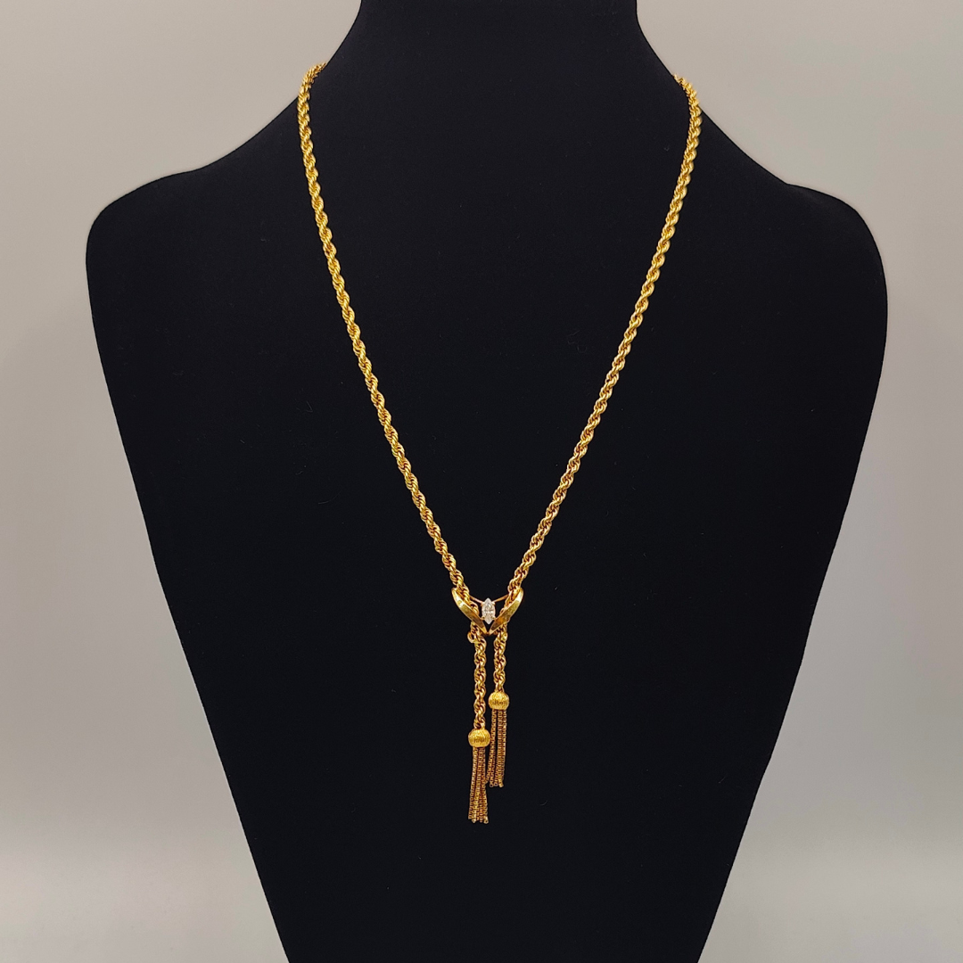 Descubre la sofisticación y el encanto de nuestro cordón de oro de 18 quilates, de 42 cm de longitud y 3 mm de grosor. Este diseño exclusivo presenta elegantes borlas en cada extremo, unidas por una delicada flor con una brillante circonita en el centro. La combinación del diseño detallado y el resplandor de la circonita hace de este collar una pieza única y exquisita. Perfecto para ocasiones especiales o para añadir un toque de elegancia a tu estilo diario, este cordón es un verdadero tesoro que resaltará tu buen gusto y sofisticación.