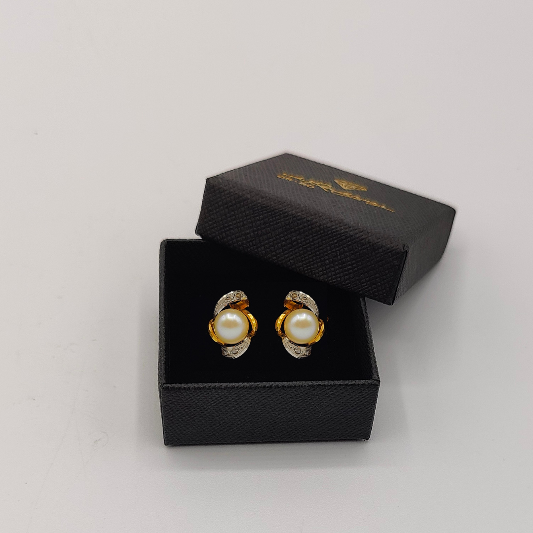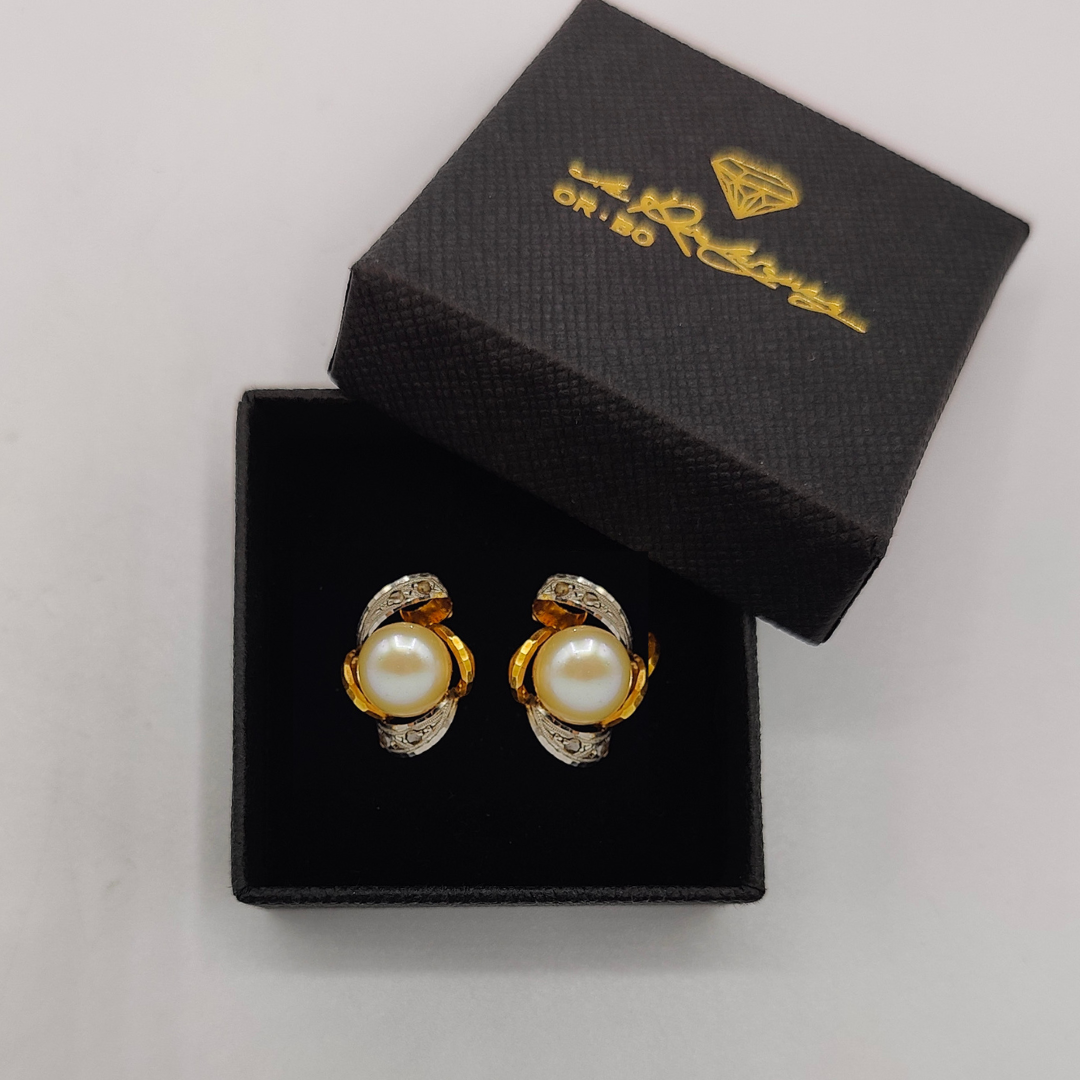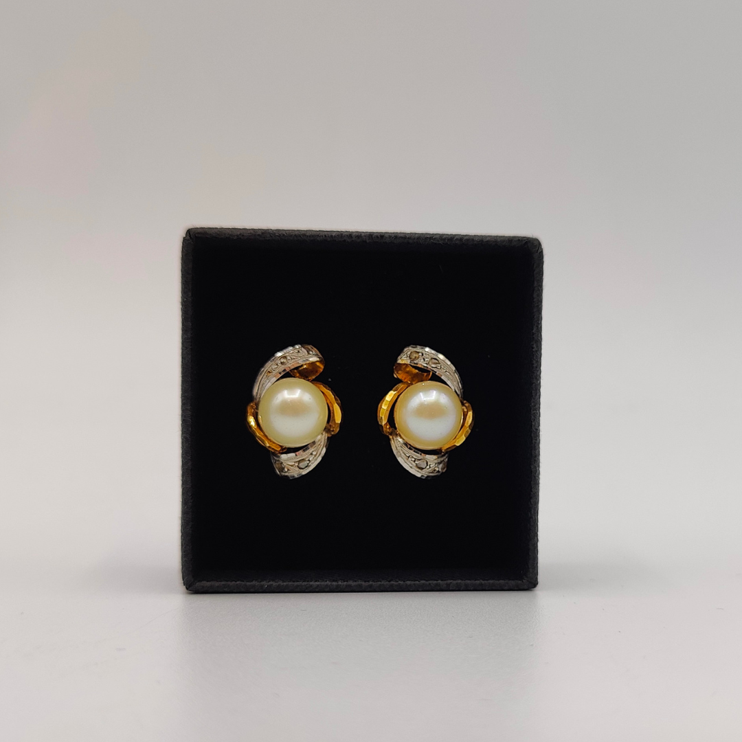 Este sofisticado pendiente estilo botón presenta una perla central que irradia elegancia y sofisticación. La perla está enmarcada por una estructura floral de oro dorado y oro blanco de 18 quilates