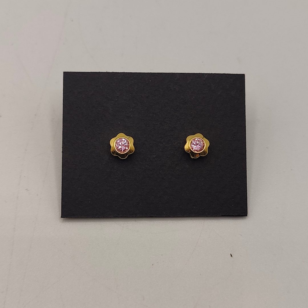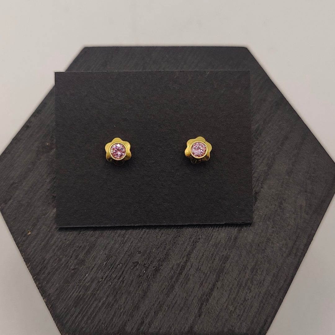 Este delicado pendiente en forma de flor está elaborado en oro de 18 quilates, resaltando su diseño femenino y elegante. En el centro, una circonita rosa.
