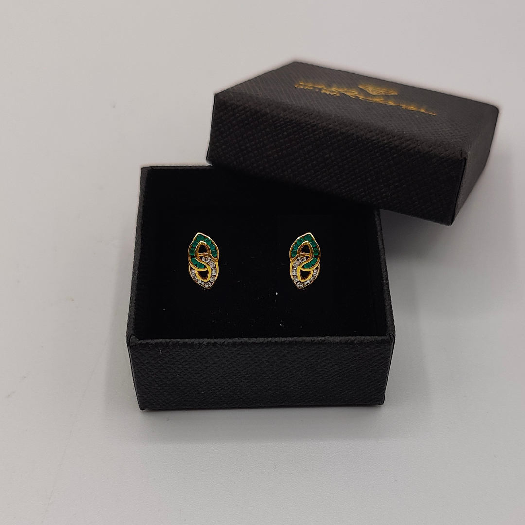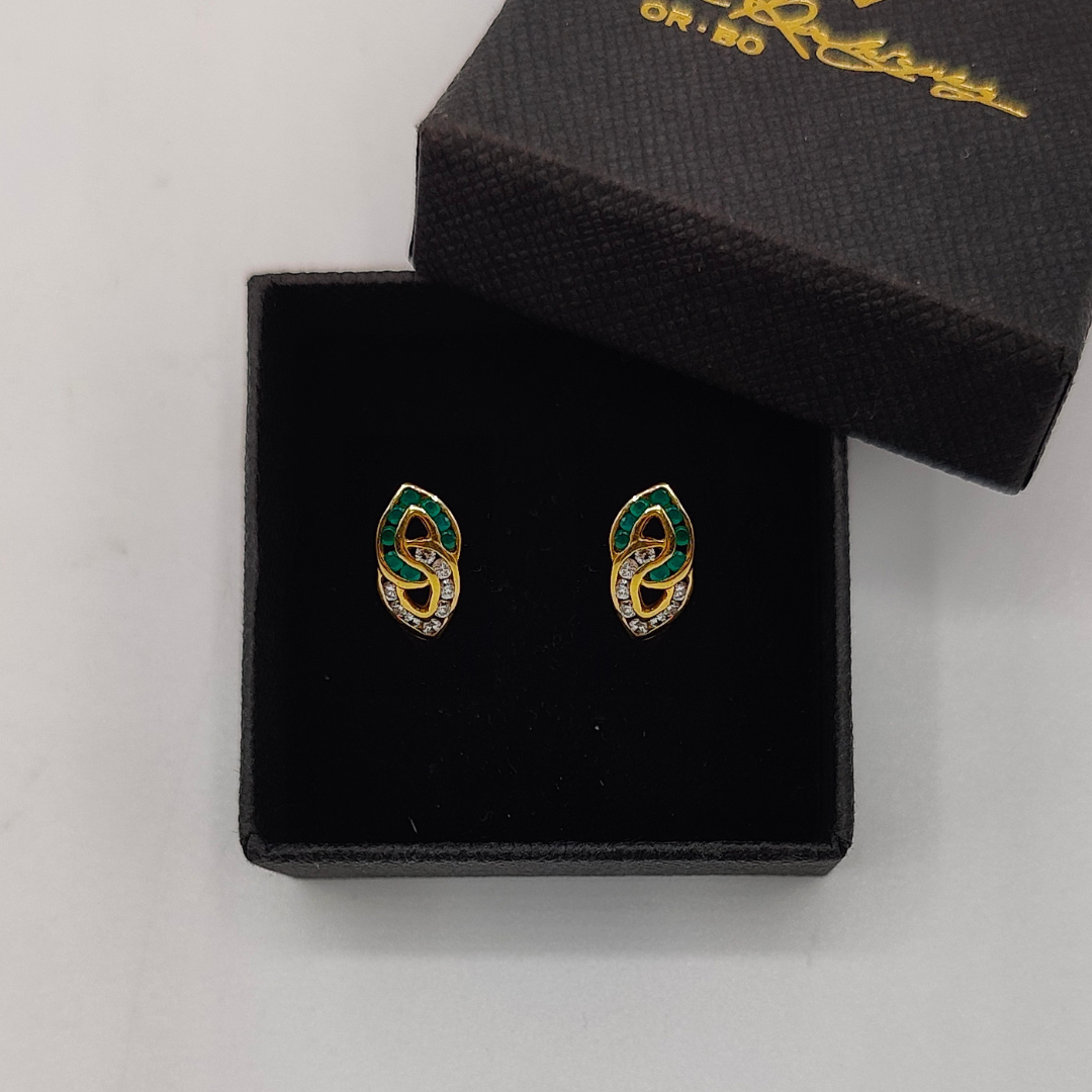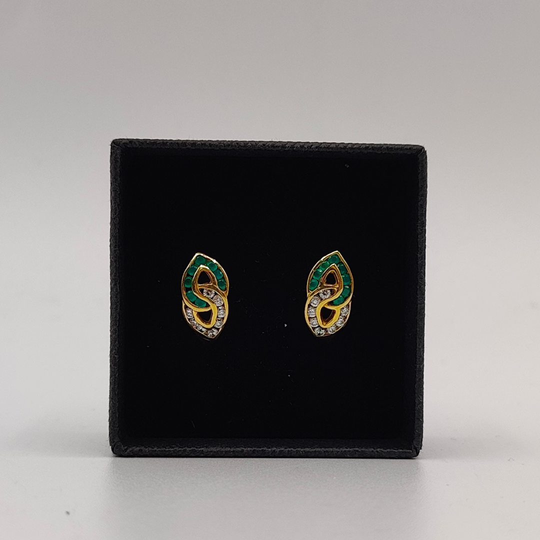 Este deslumbrante pendiente en forma de infinito está adornado con esmeraldas vibrantes y diamantes brillantes, creando un diseño elegante y atemporal.