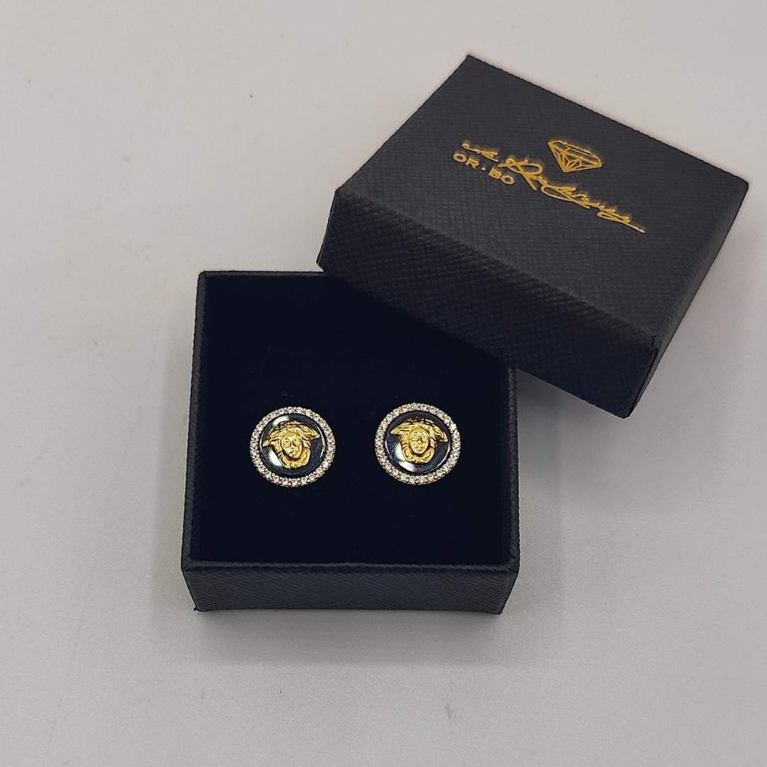 Diseño Exclusivo: El centro del pendiente presenta la emblemática Medusa de Versace, un símbolo de poder y belleza, meticulosamente elaborada en un tono dorado sobre un fondo esmaltado en negro.