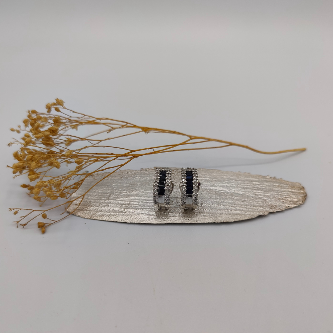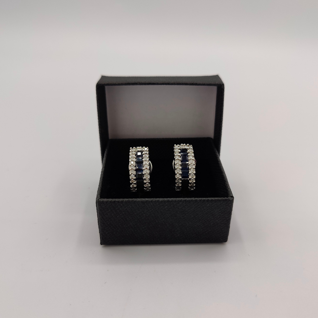 Sumérgete en el lujo con estos impresionantes pendientes semi aro, que brillan con la belleza atemporal de los diamantes y el encanto único de los zafiros azules en su centro.