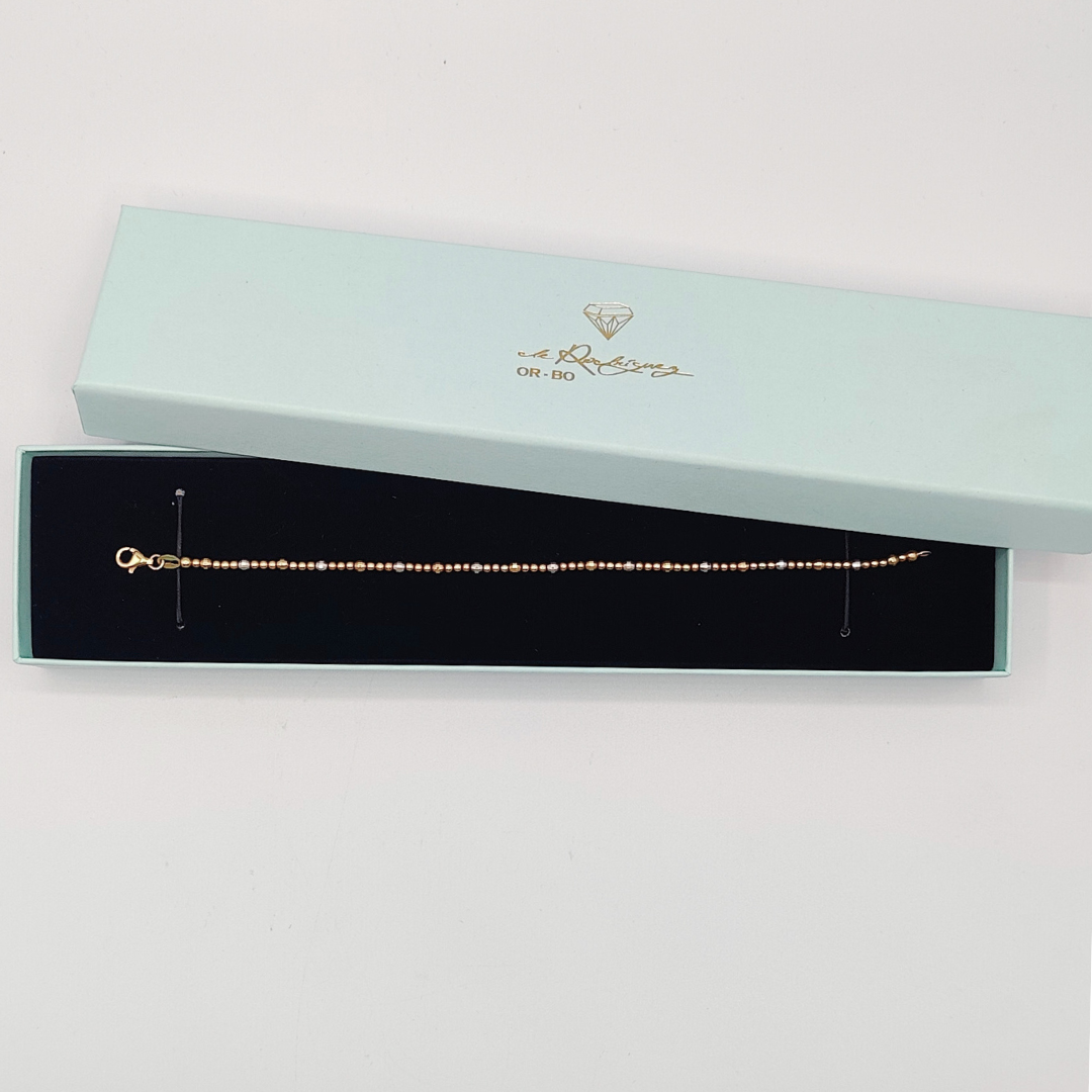 La pulsera de bolitas de 22 cm y 2 mm es una pieza delicada y versátil que destaca por su diseño sencillo y elegante. Con eslabones de 2 mm en forma de pequeñas bolitas.