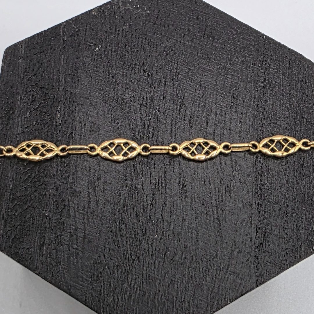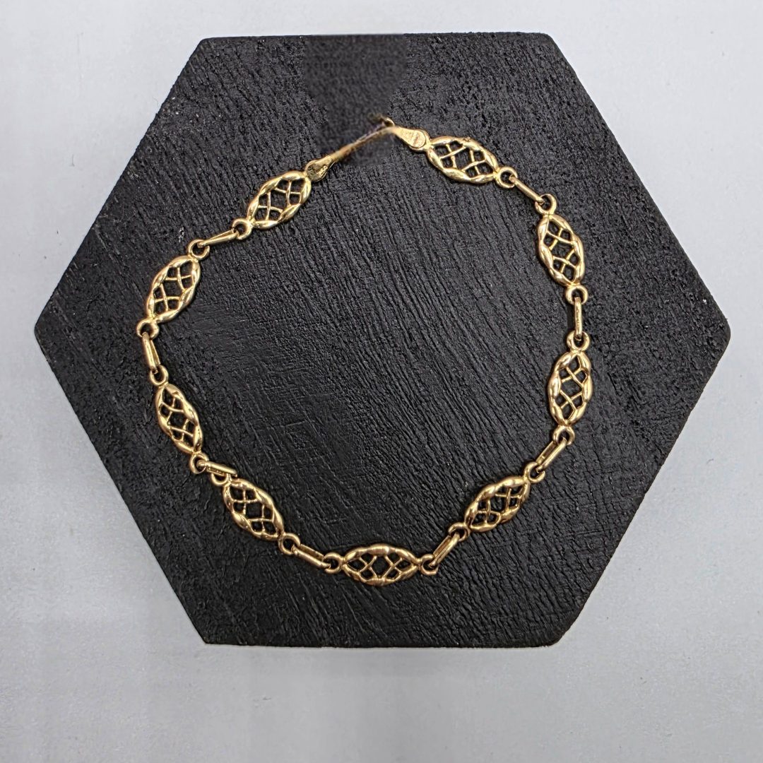 Esta sofisticada pulsera en oro de 18 quilates presenta eslabones con intrincados dibujos calados que aportan un toque de elegancia y detalle.