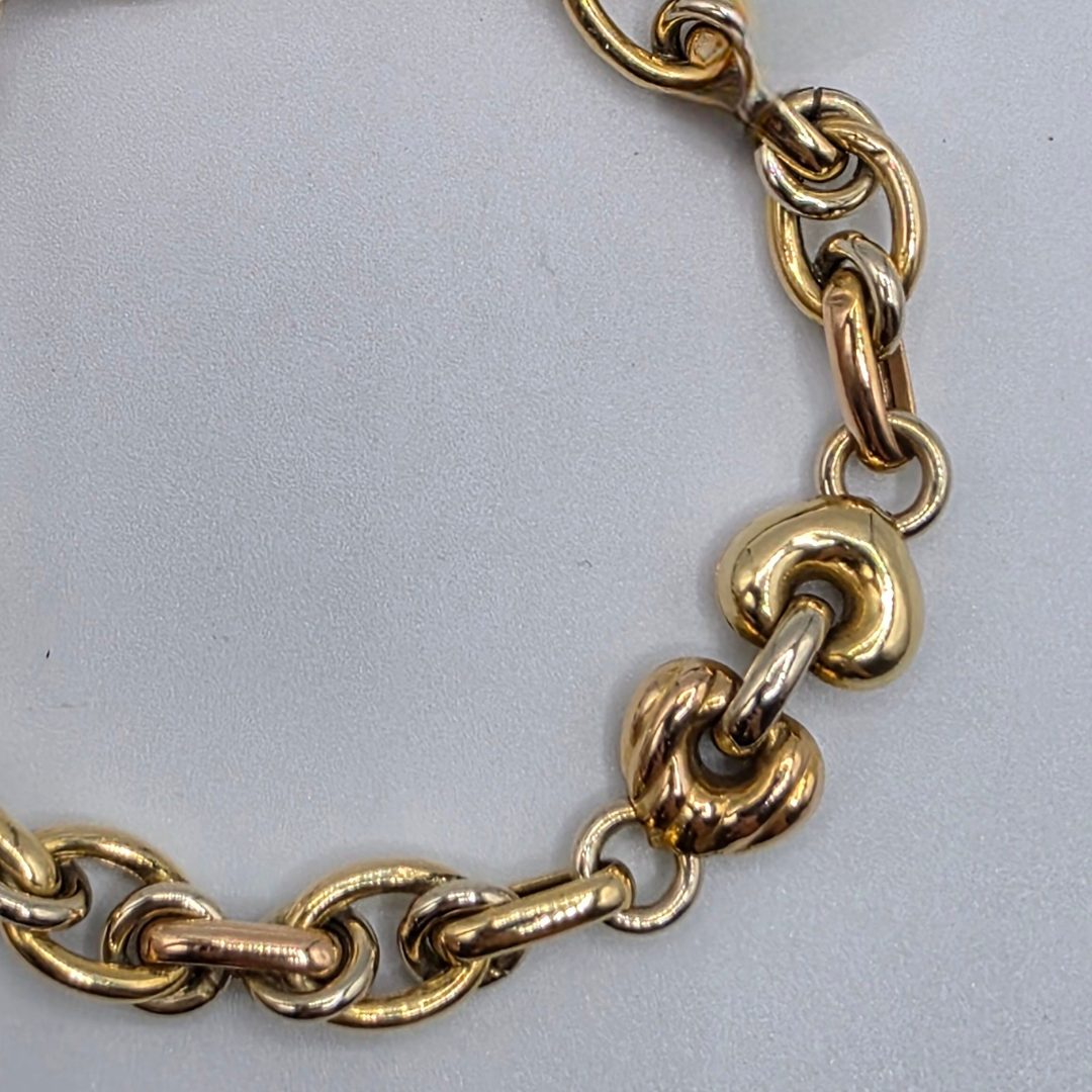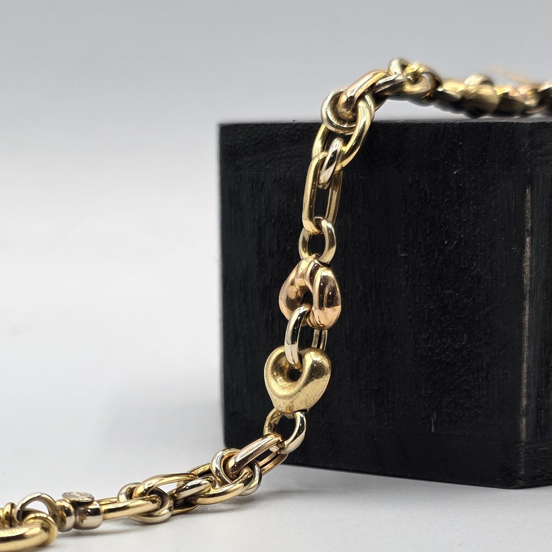 Esta elegante pulsera en oro de 18 quilates presenta un diseño sofisticado con corazones entrelazados en forma de rolo, creando una pieza única y llena de simbolismo. La mezcla de oro dorado y rosado aporta un contraste cálido y romántico, mientras que el diseño entrelazado aporta dinamismo y textura a la joya. Con 19,5 cm de largo y 11 mm de ancho, esta pulsera tiene un tamaño perfecto para quienes buscan una pieza llamativa pero elegante. Ideal para ocasiones especiales o como un regalo significativo, esta pulsera es una declaración de amor y sofisticación.