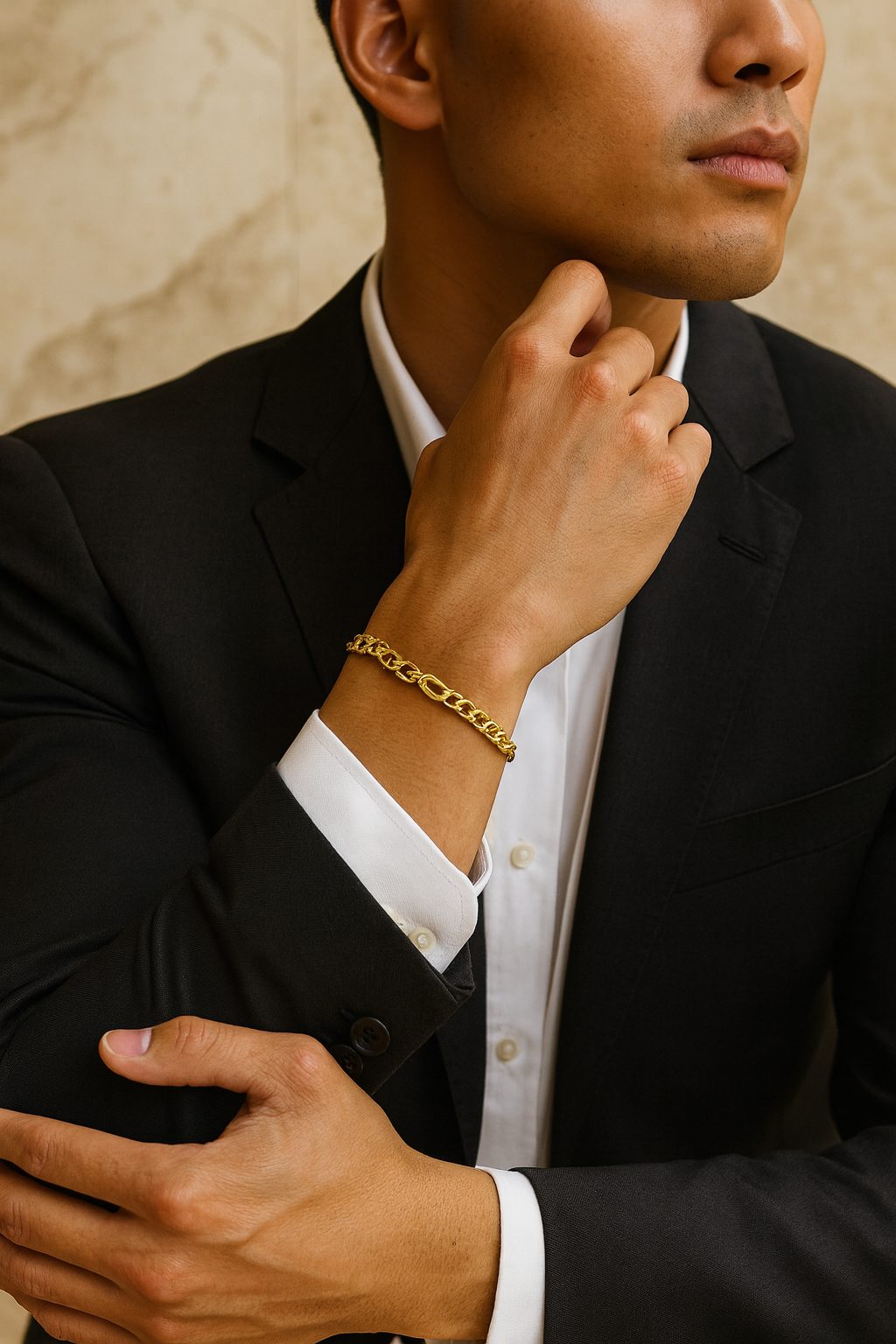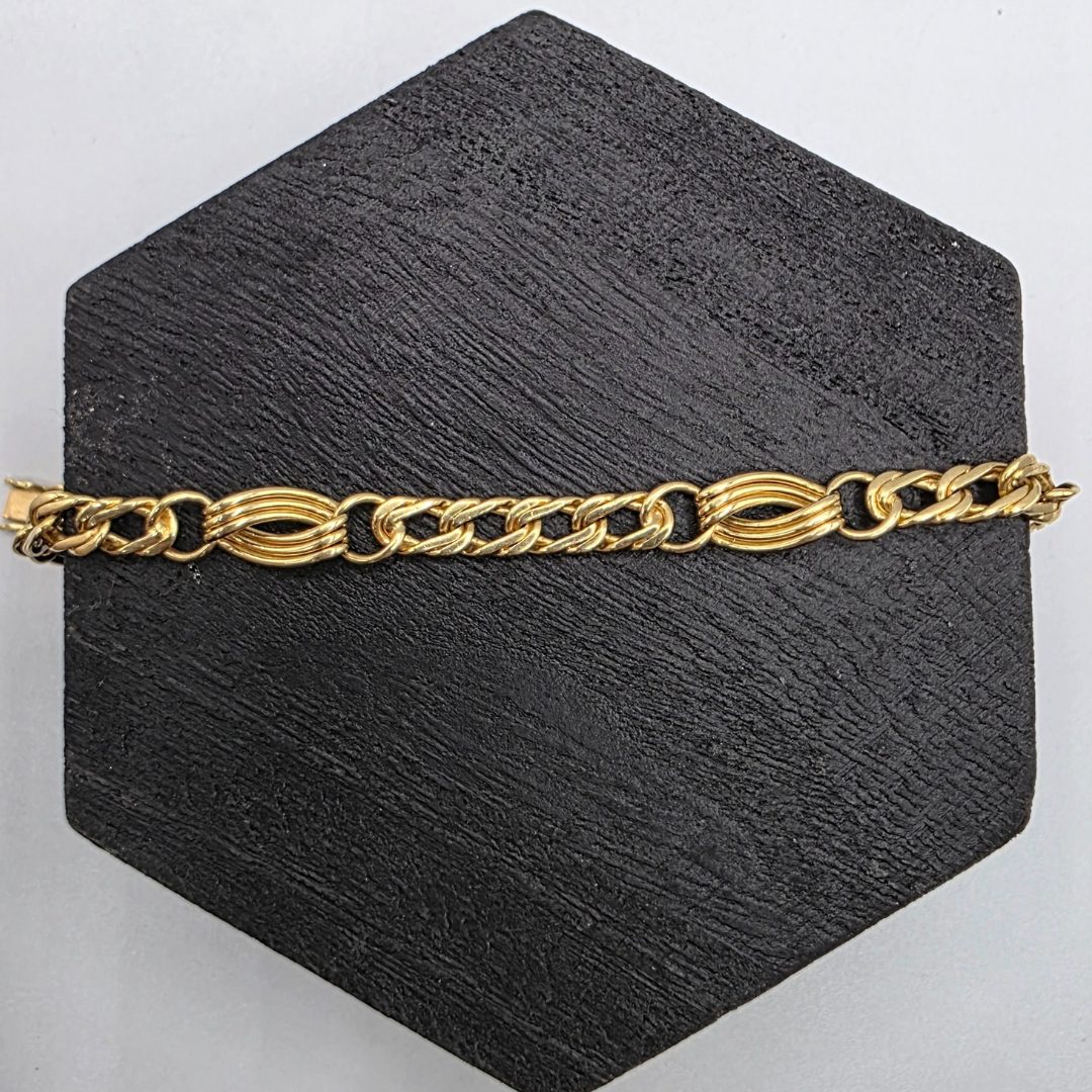 Esta elegante pulsera Figaro en oro de 18 quilates presenta un diseño clásico de eslabones alternados con un efecto triple, lo que le da una textura dinámica y sofisticada. Con un largo de 20 cm y un ancho de 7 mm, ofrece un tamaño llamativo y cómodo para llevar en cualquier ocasión. El cierre cajón asegura un ajuste seguro y fácil de usar. El oro de 18K proporciona durabilidad y un brillo sutil, convirtiéndola en una pieza versátil y atemporal que combina lujo y estilo. Ideal para quienes buscan una joya moderna y refinada para complementar su look.