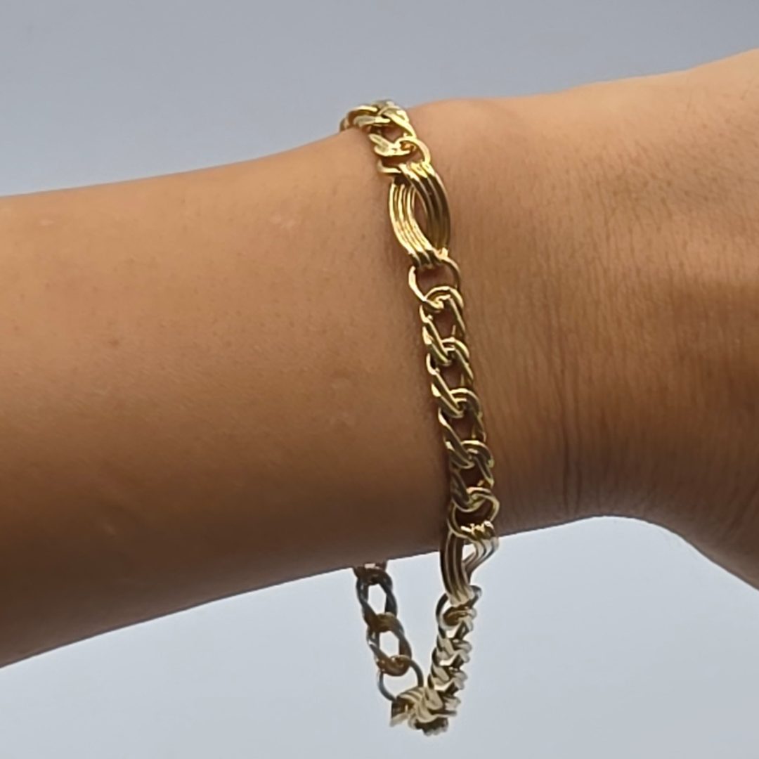 Esta elegante pulsera Figaro en oro de 18 quilates presenta un diseño clásico de eslabones alternados con un efecto triple, lo que le da una textura dinámica y sofisticada.