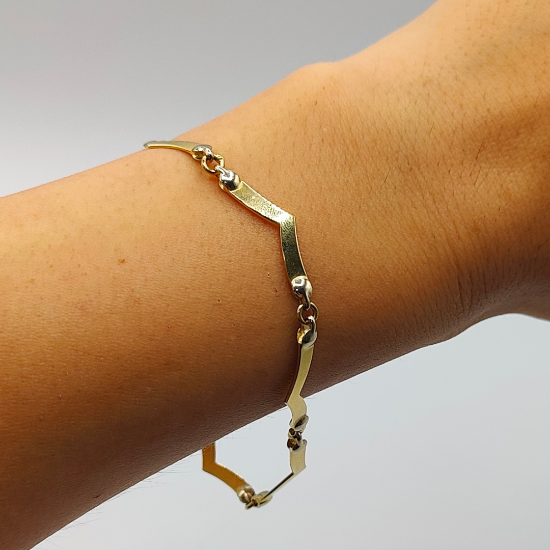 La pulsera de hondas en puntas es una pieza distintiva que destaca por su diseño geométrico y elegante. Su estructura se caracteriza por un patrón de ondas