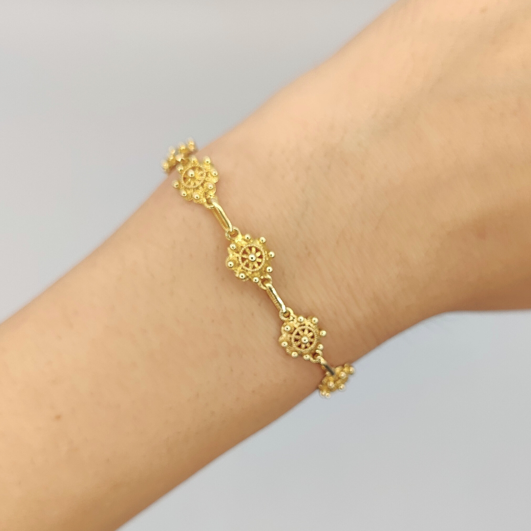 La pulsera de oro de 18 quilates con timones marítimos repetidos es una joya que encarna la elegancia náutica y el espíritu aventurero. Cada timón, delicadamente elaborado, se alinea en una secuencia perfecta a lo largo de la pulsera, creando un patrón armonioso y distintivo. El brillo cálido del oro resalta los detalles finos de cada timón, haciendo que la pulsera brille con una belleza sofisticada y continua.